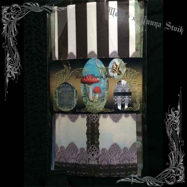 Vertical black and white stripes on one side with a lace garter image, and the poisonous mushroom, Amanita Muscaria, at your feet, a butterfly leading you upwards towards a set of doors...