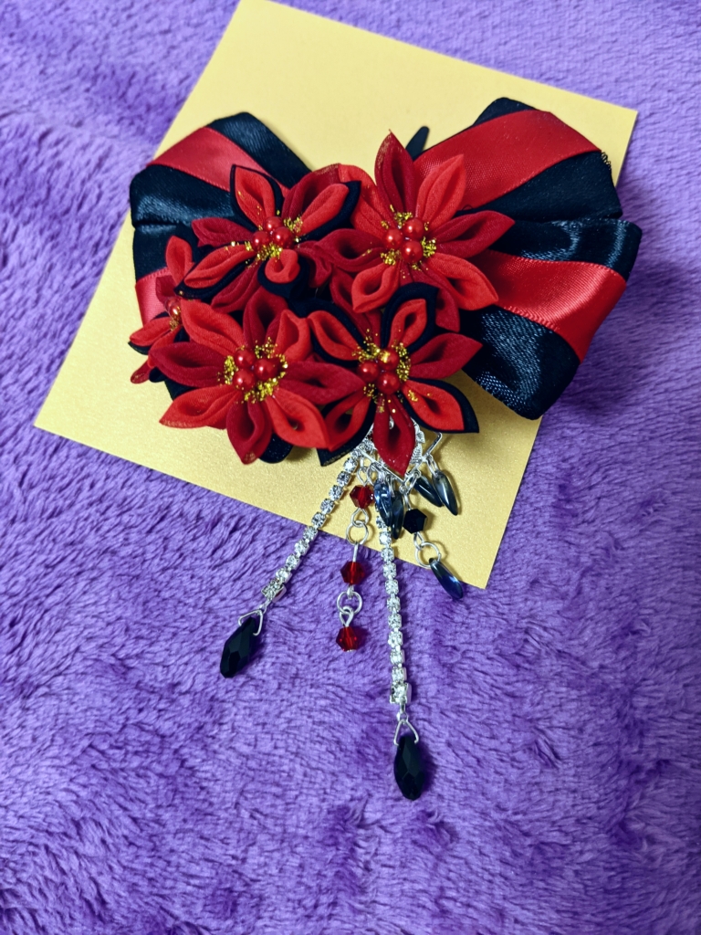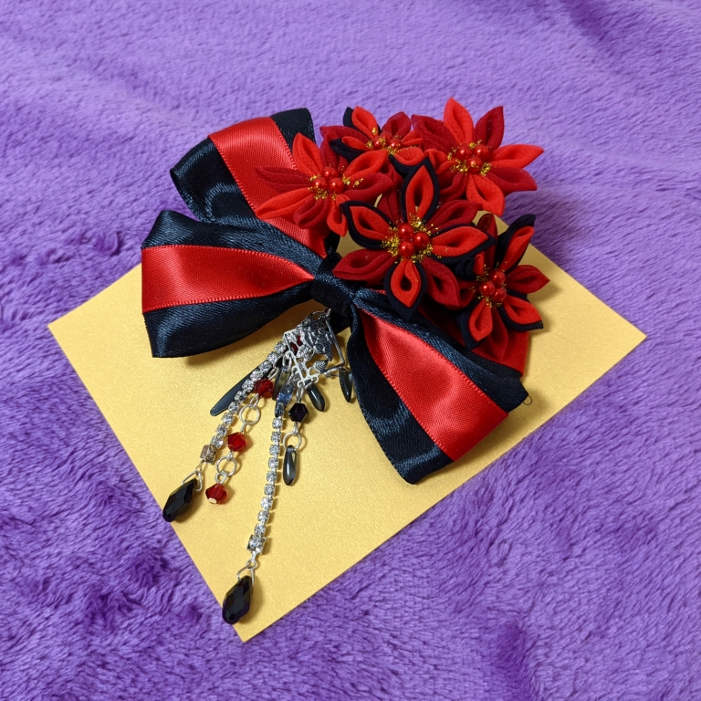 Part of Orishian's Girly collection, this clip kanzashi, adorned with ribbons and a rose charm, in a red and black color combination adds a nice touch to your kimono or wa-lolita coordinate!