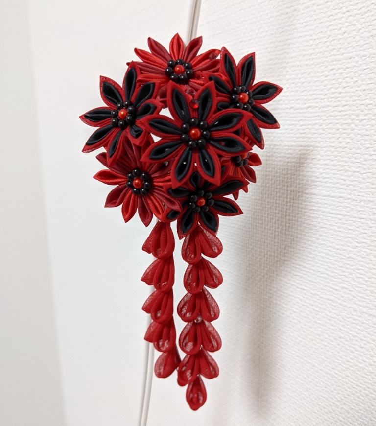 This original red and black kanzashi is handmade by traditional Japanese artisan Orishian.