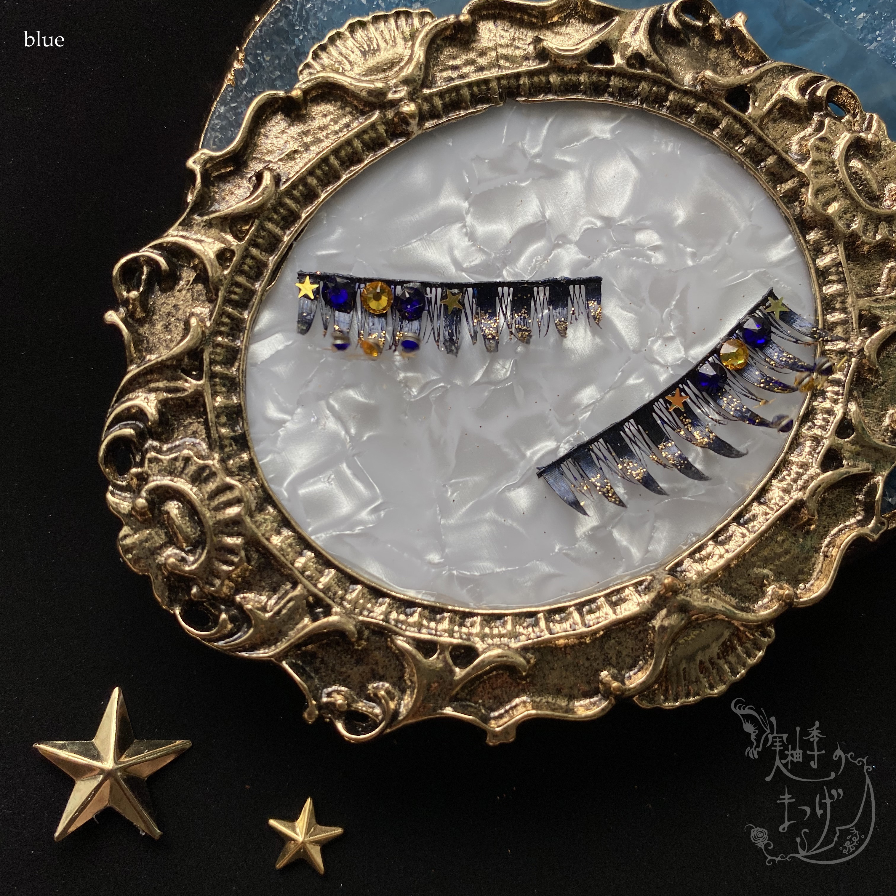 ・Materials: Synthetic eyelashes, Swarovski crystals, plated metal, adhesive, glitter, resin