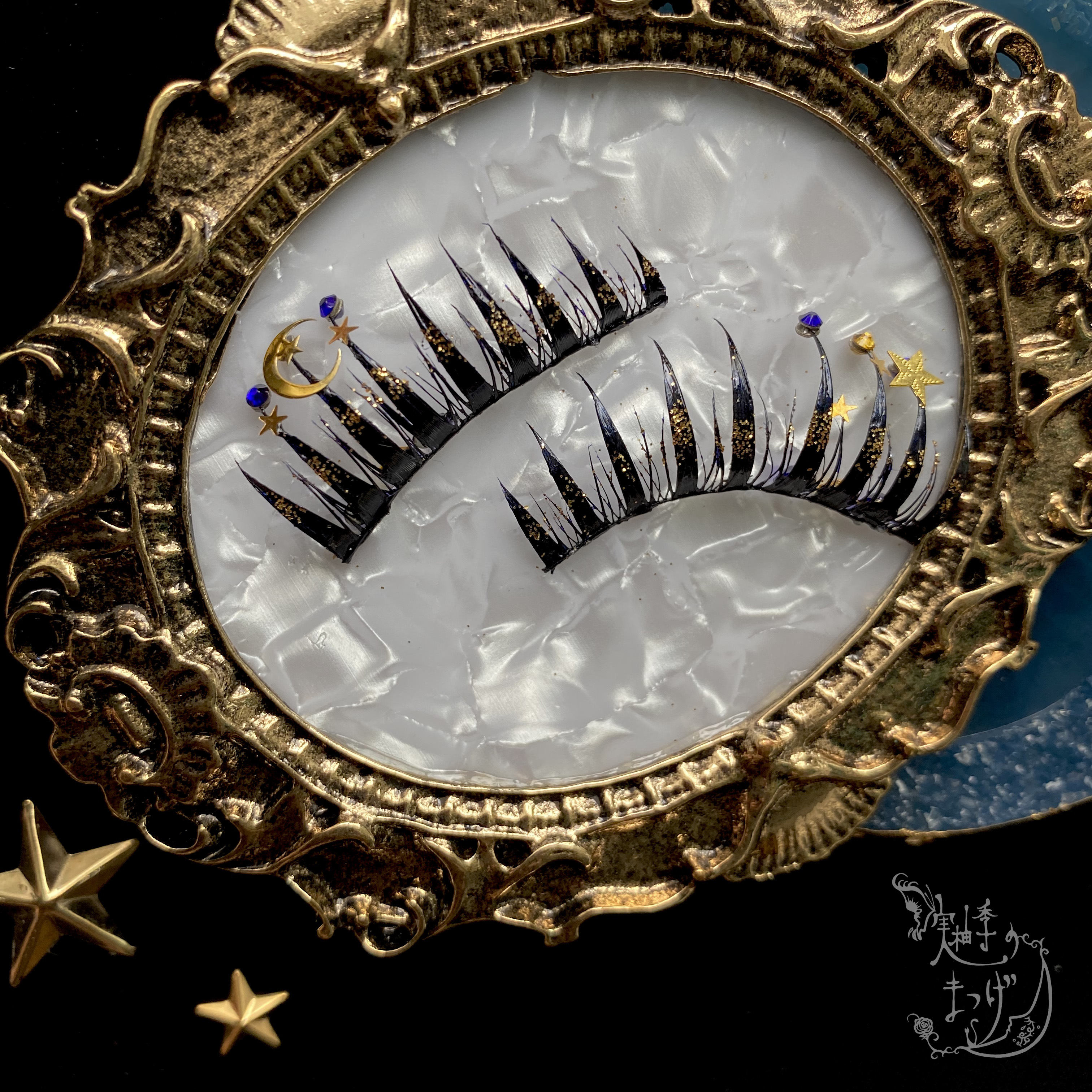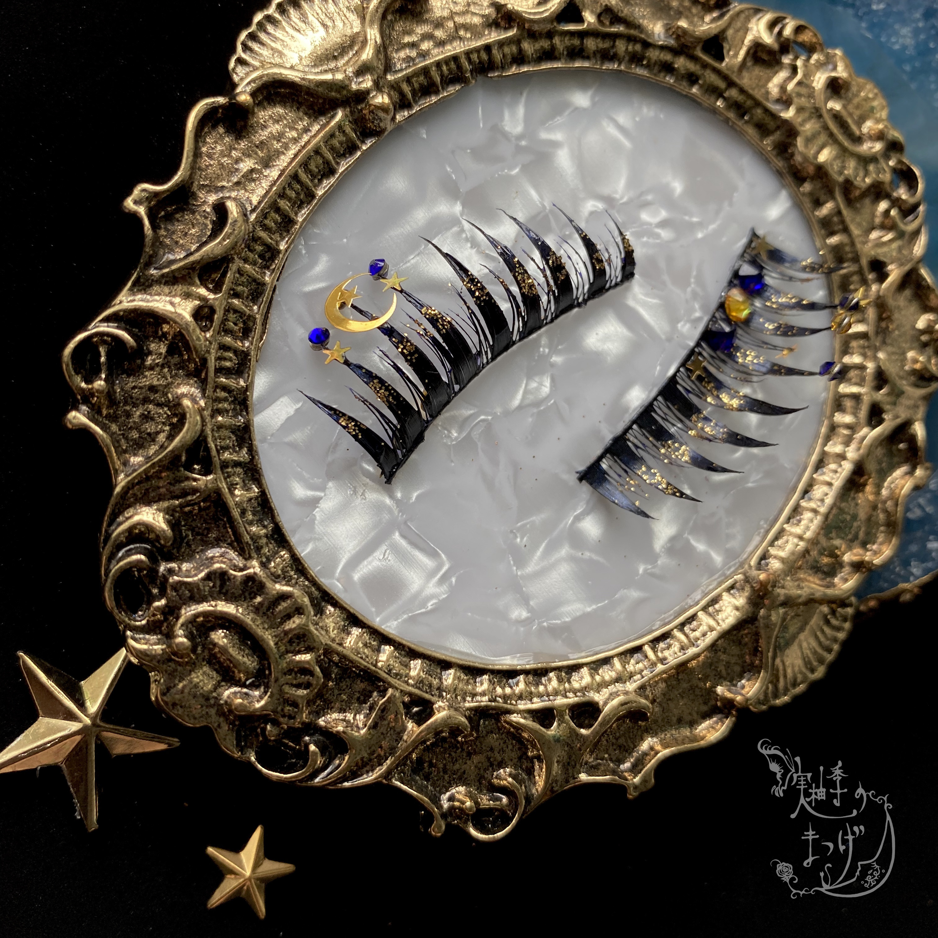 False eyelashes dyed with the shining stars in the night sky, decorated with moon and star motifs.