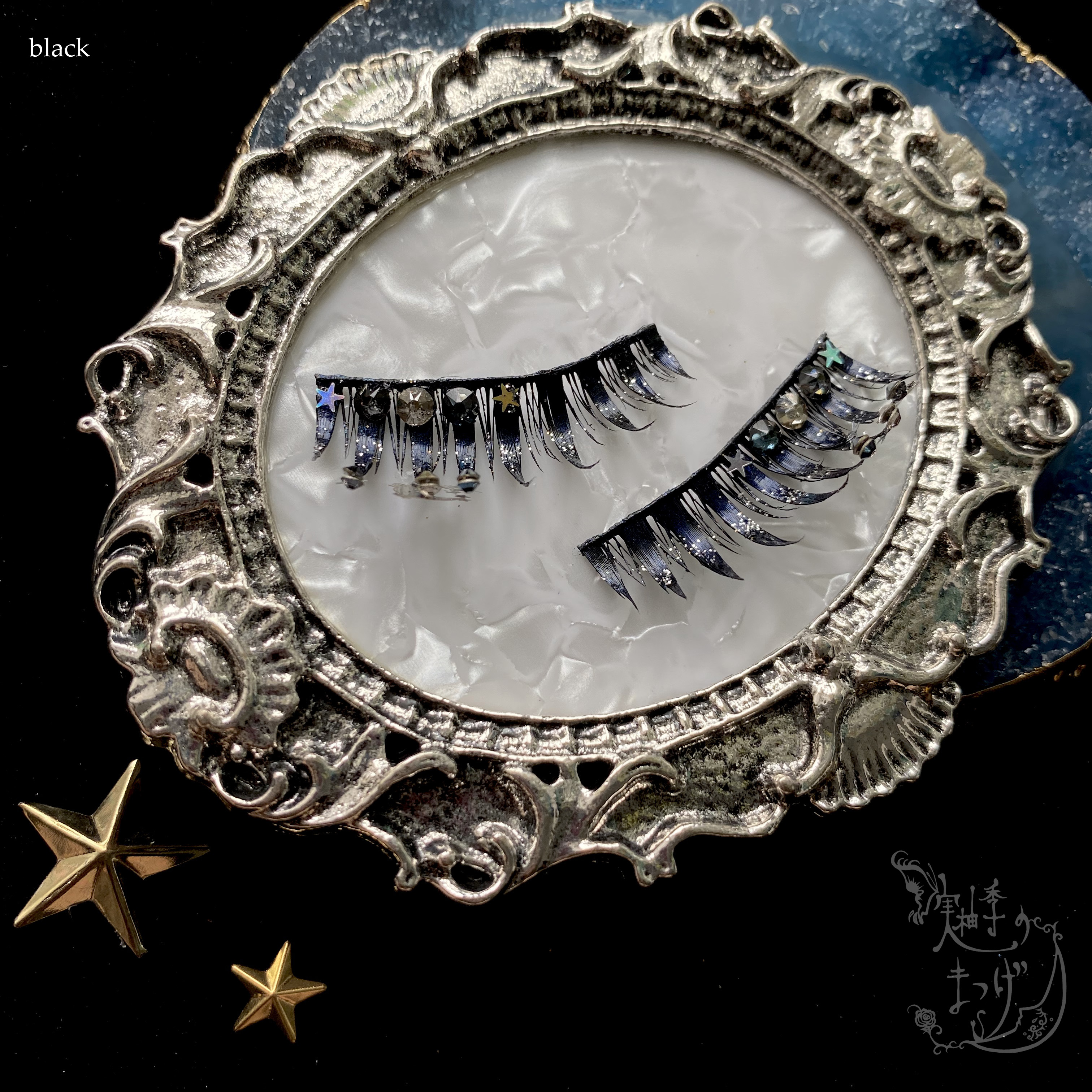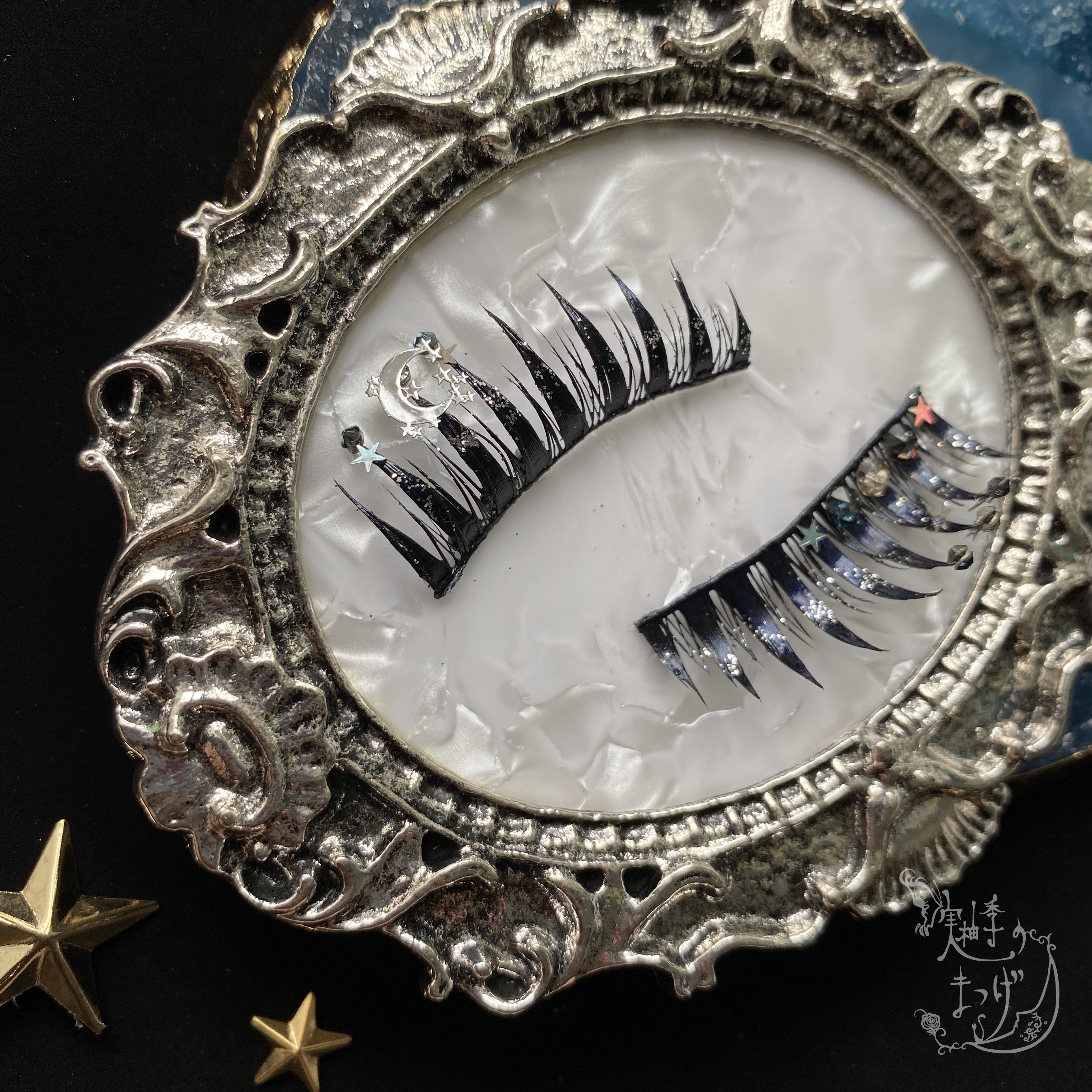 False eyelashes dyed with the shining stars in the night sky, decorated with moon and star motifs.