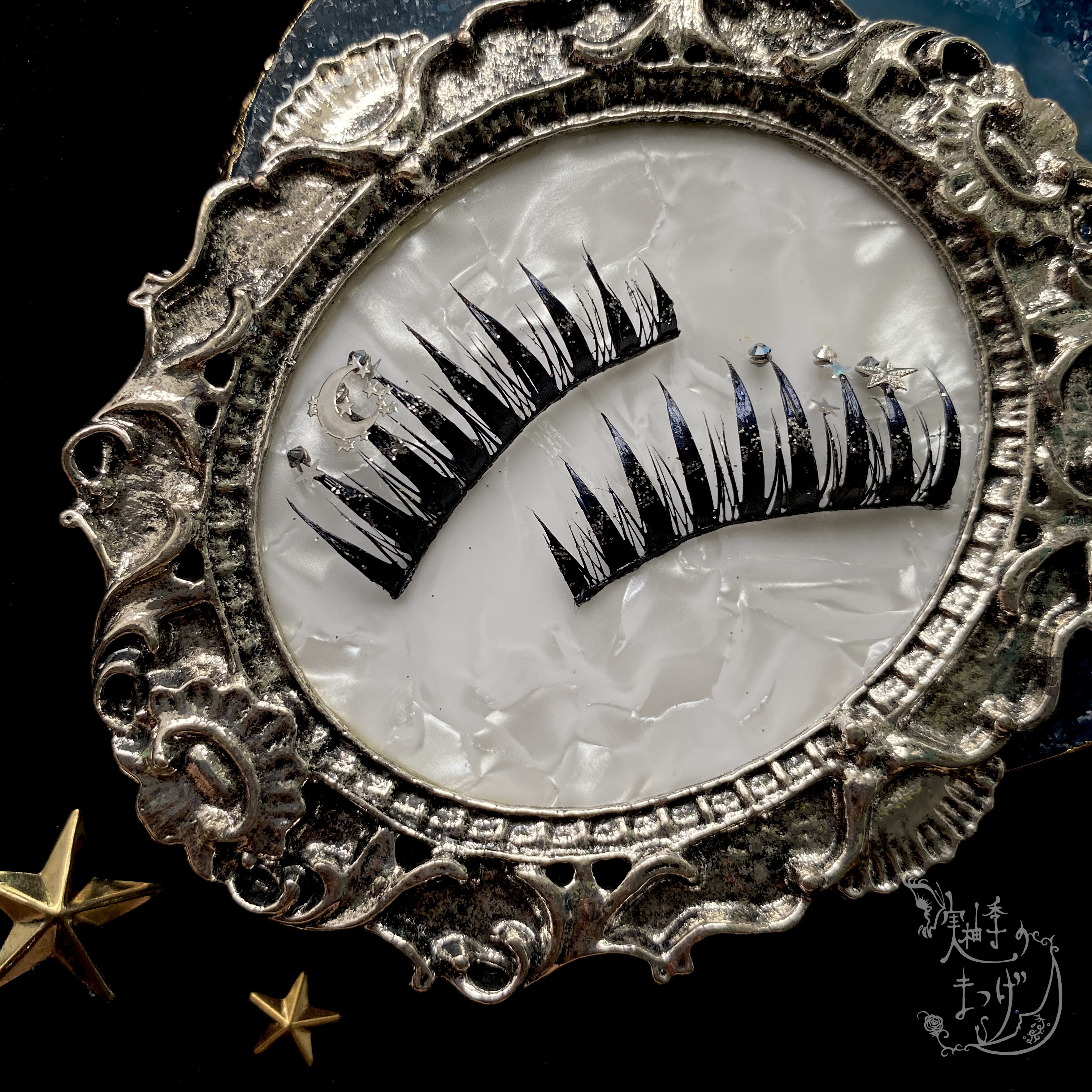 ・Materials: Synthetic eyelashes, Swarovski crystals, plated metal, adhesive, glitter, resin