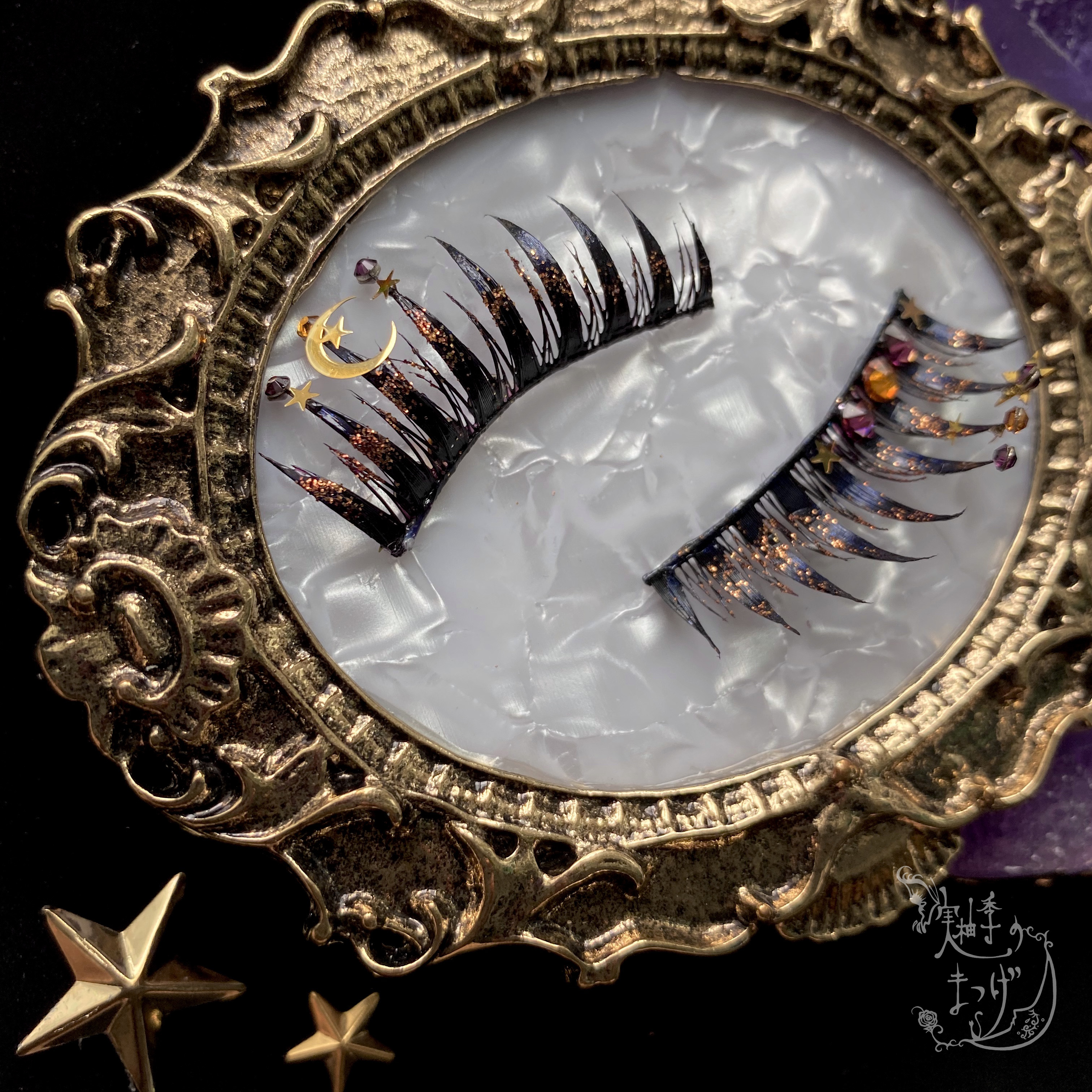 ・Materials: Synthetic eyelashes, Swarovski crystals, plated metal, adhesive, glitter, resin