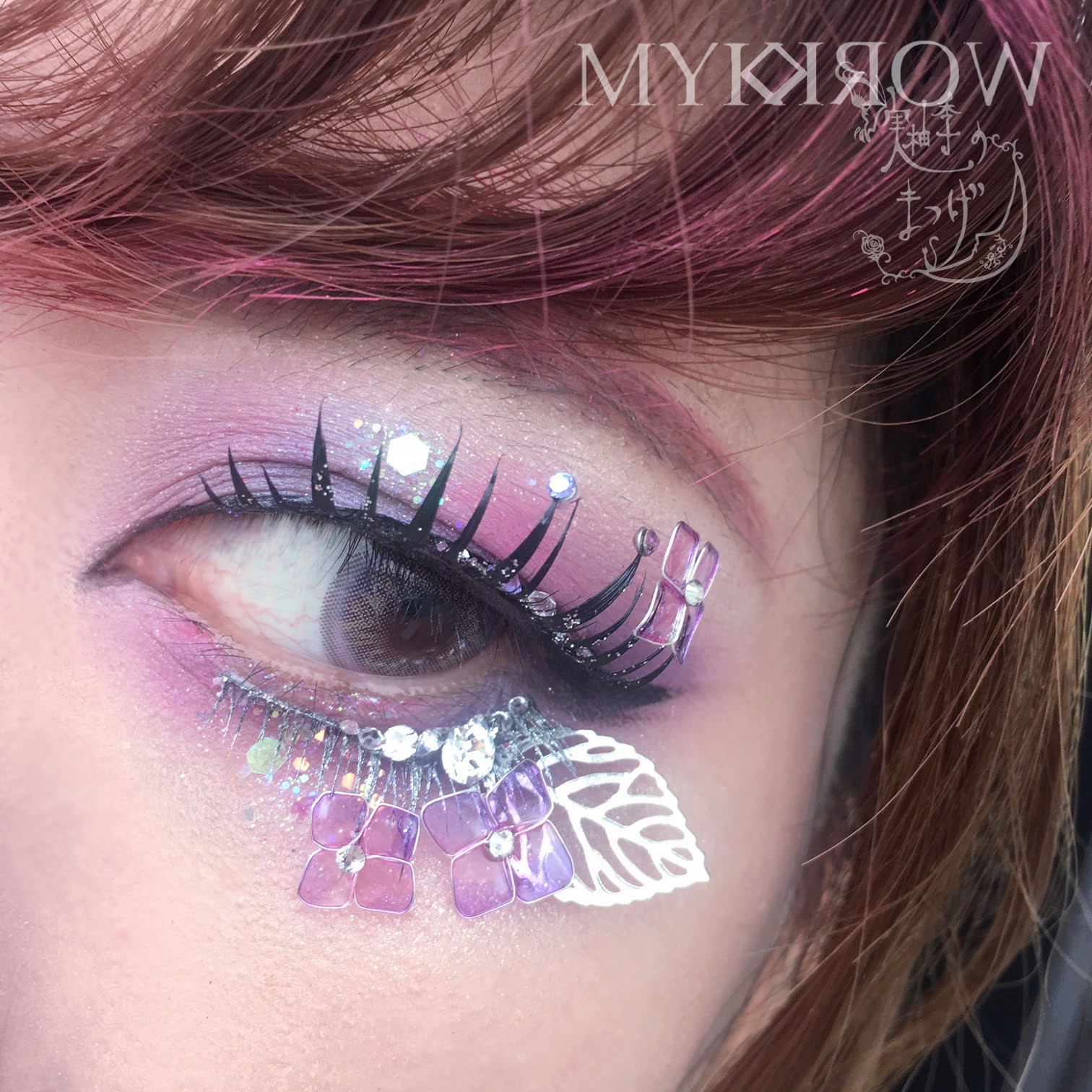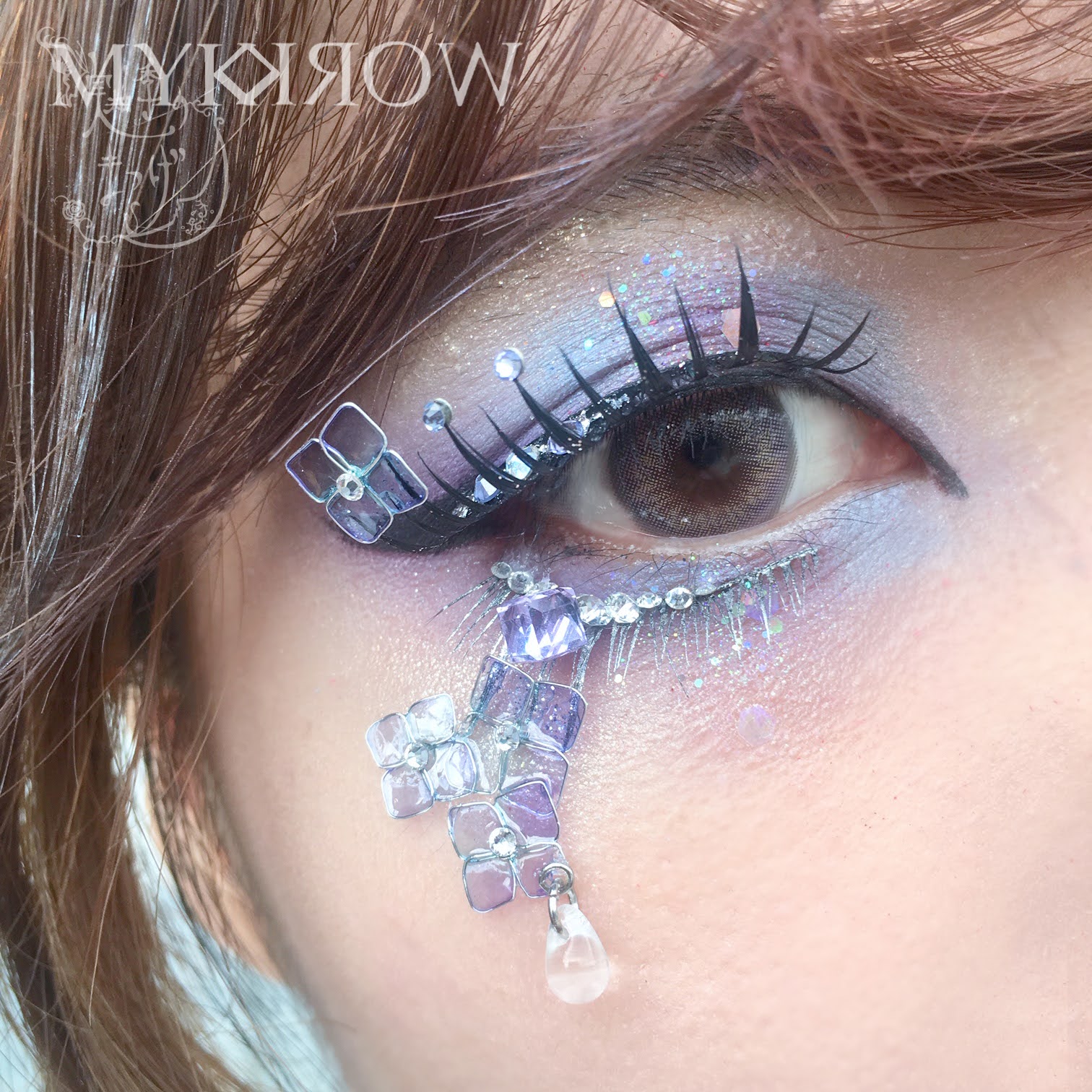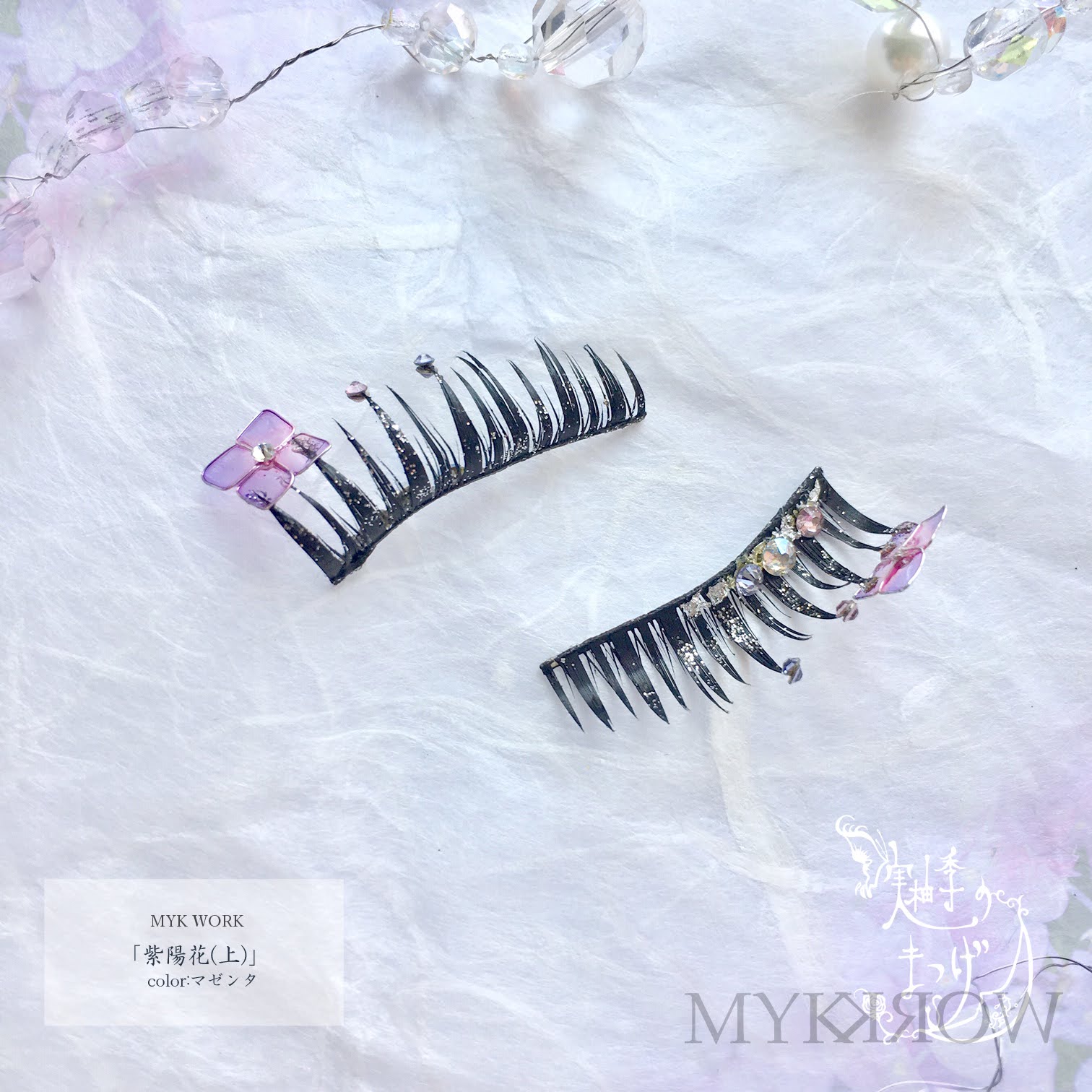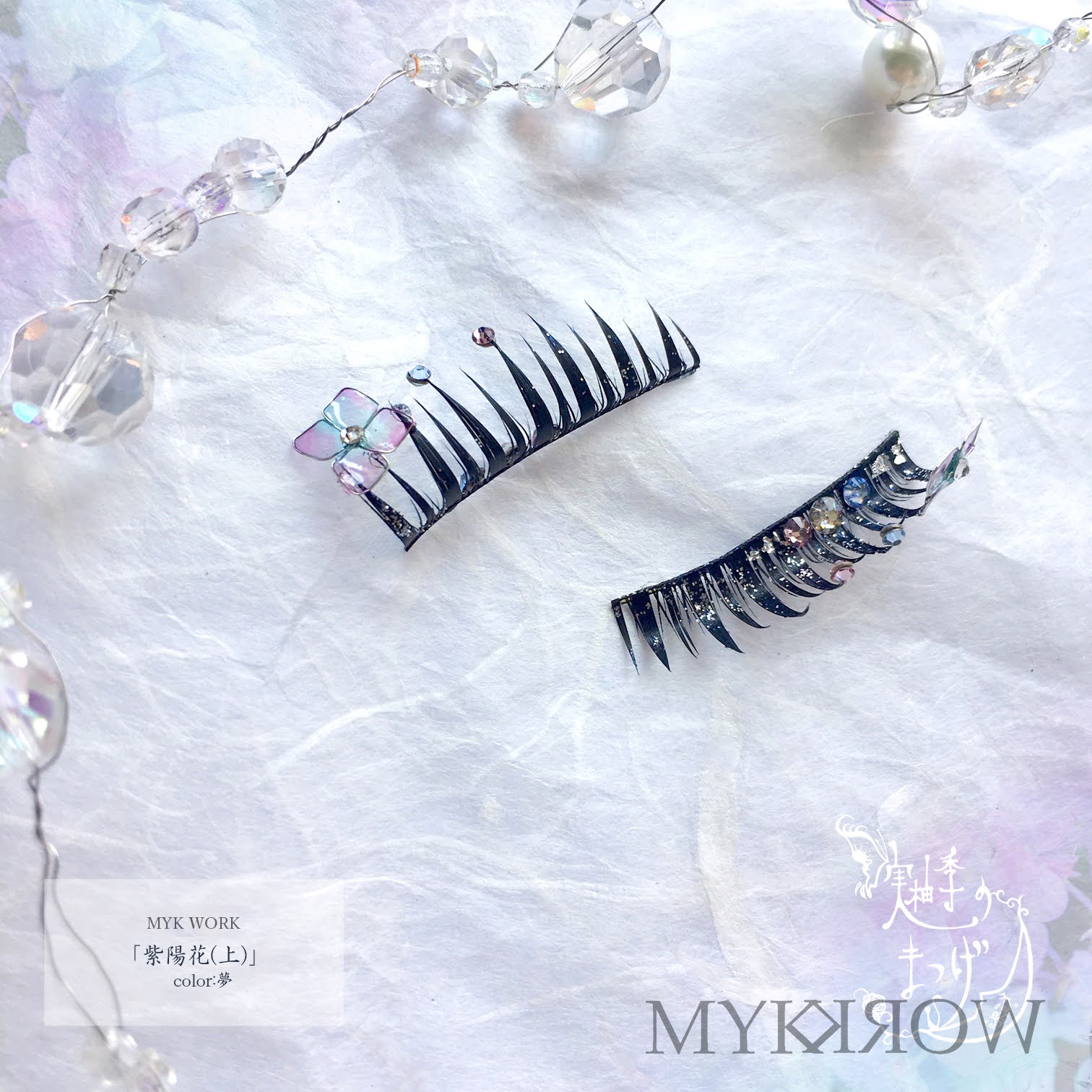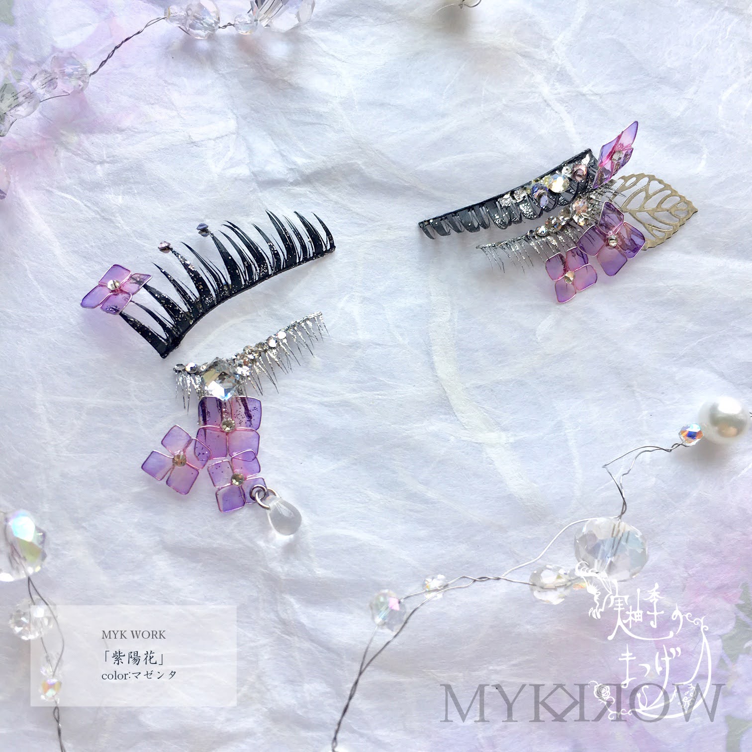 ・Materials: Synthetic eyelashes, Swarovski crystals, plated metal, adhesive, glitter, resin