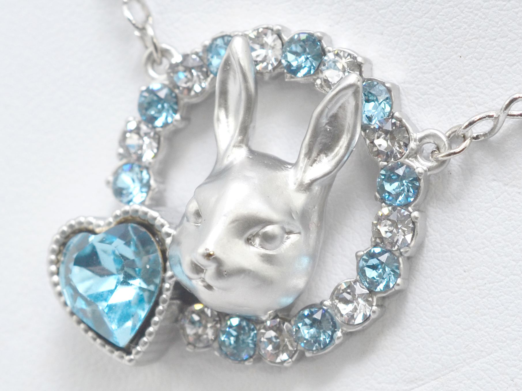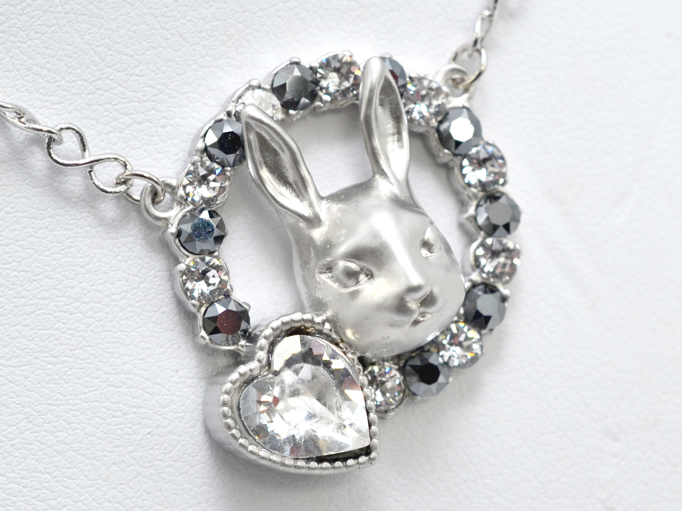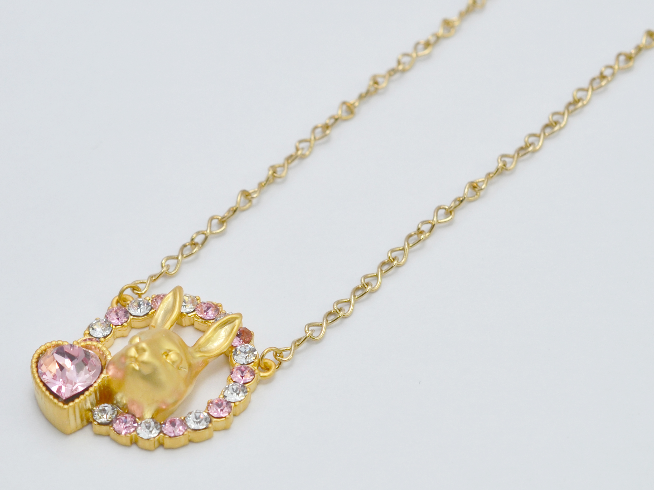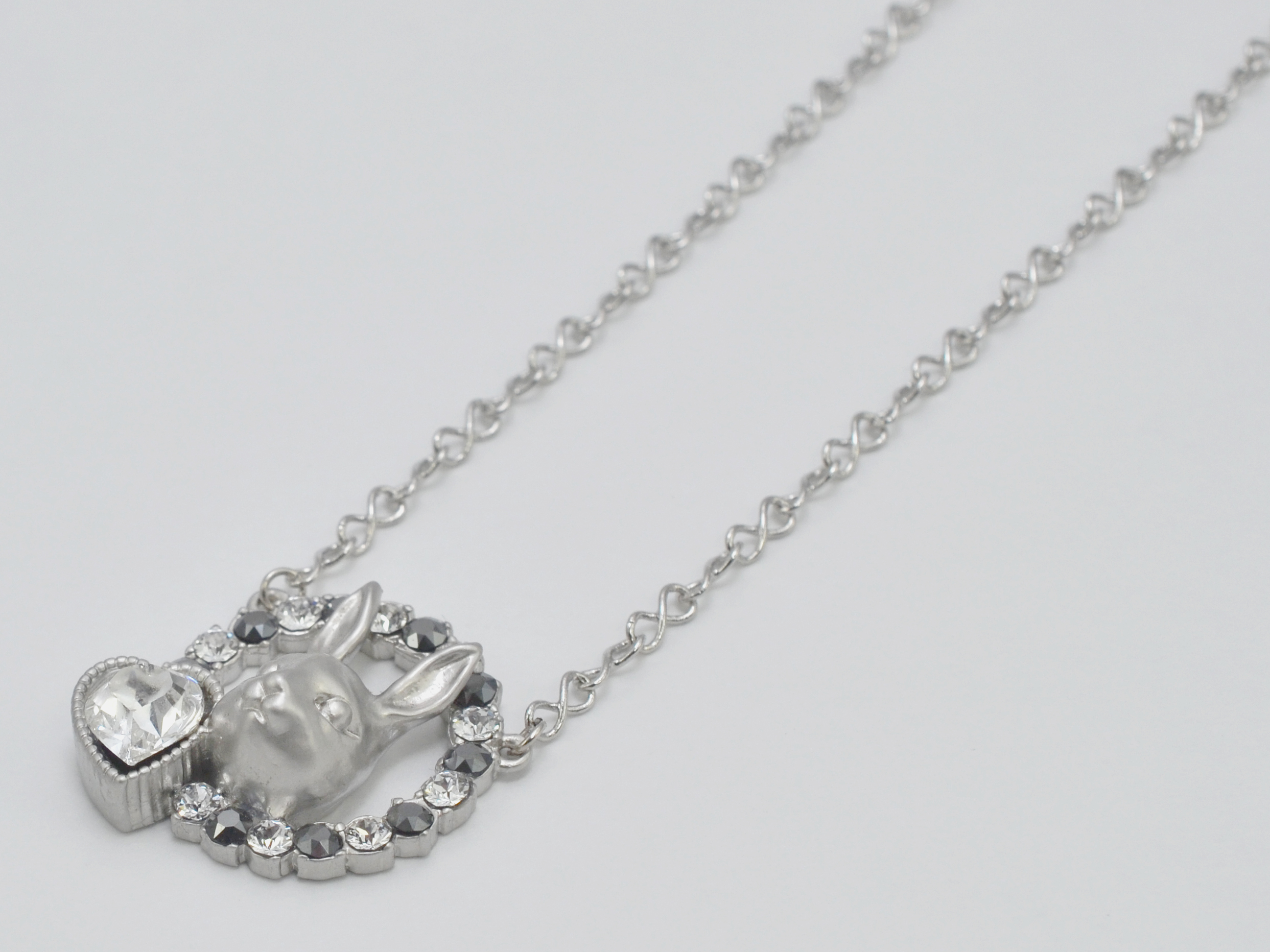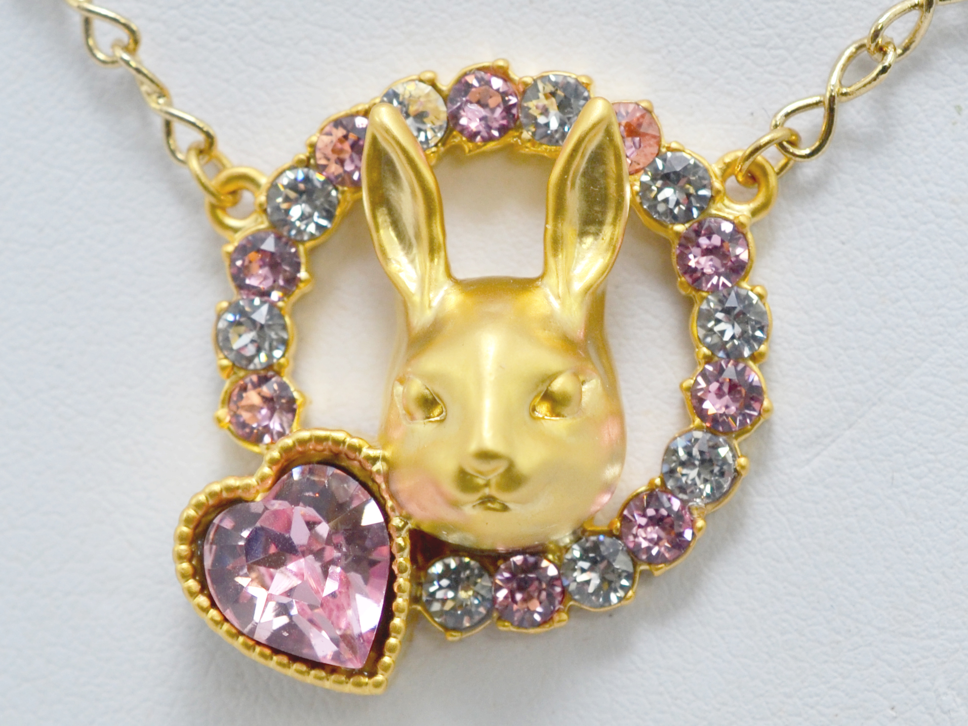 A rabbit's face surrounded by a halo of crystals and a heart shaped stone, in a soft matte metallic. This necklace is a versatile piece that can add a great touch to your outfit whether it be formal or casual.