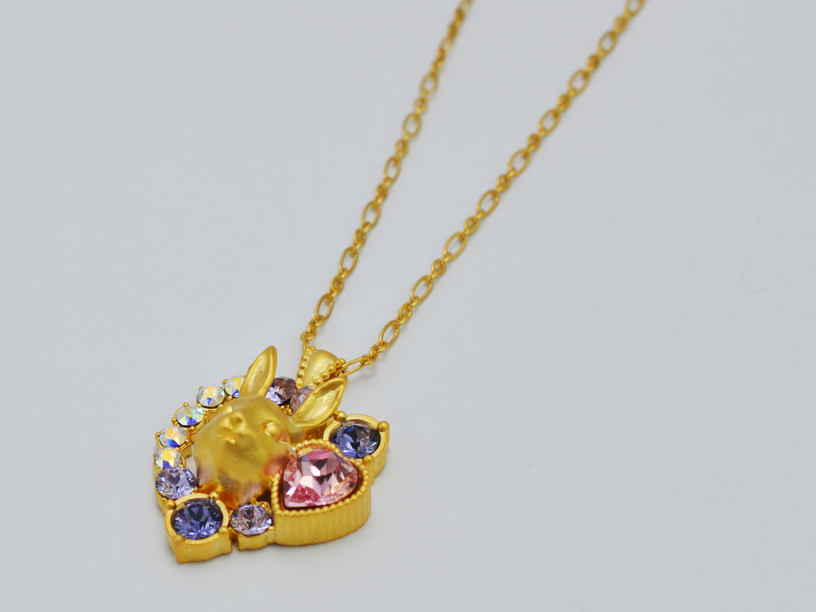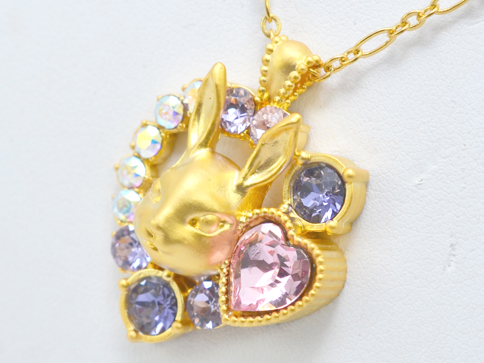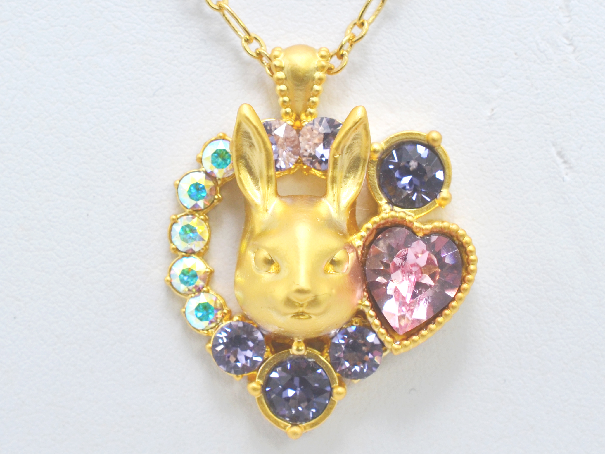 A rabbit's face surrounded by a plethora of soft colorful crystals and a heart shaped stone, in a gentle matte metallic color for an extravagant piece.