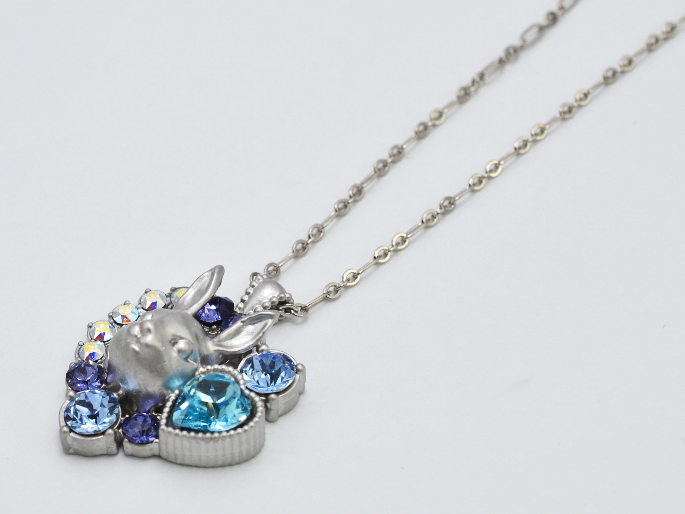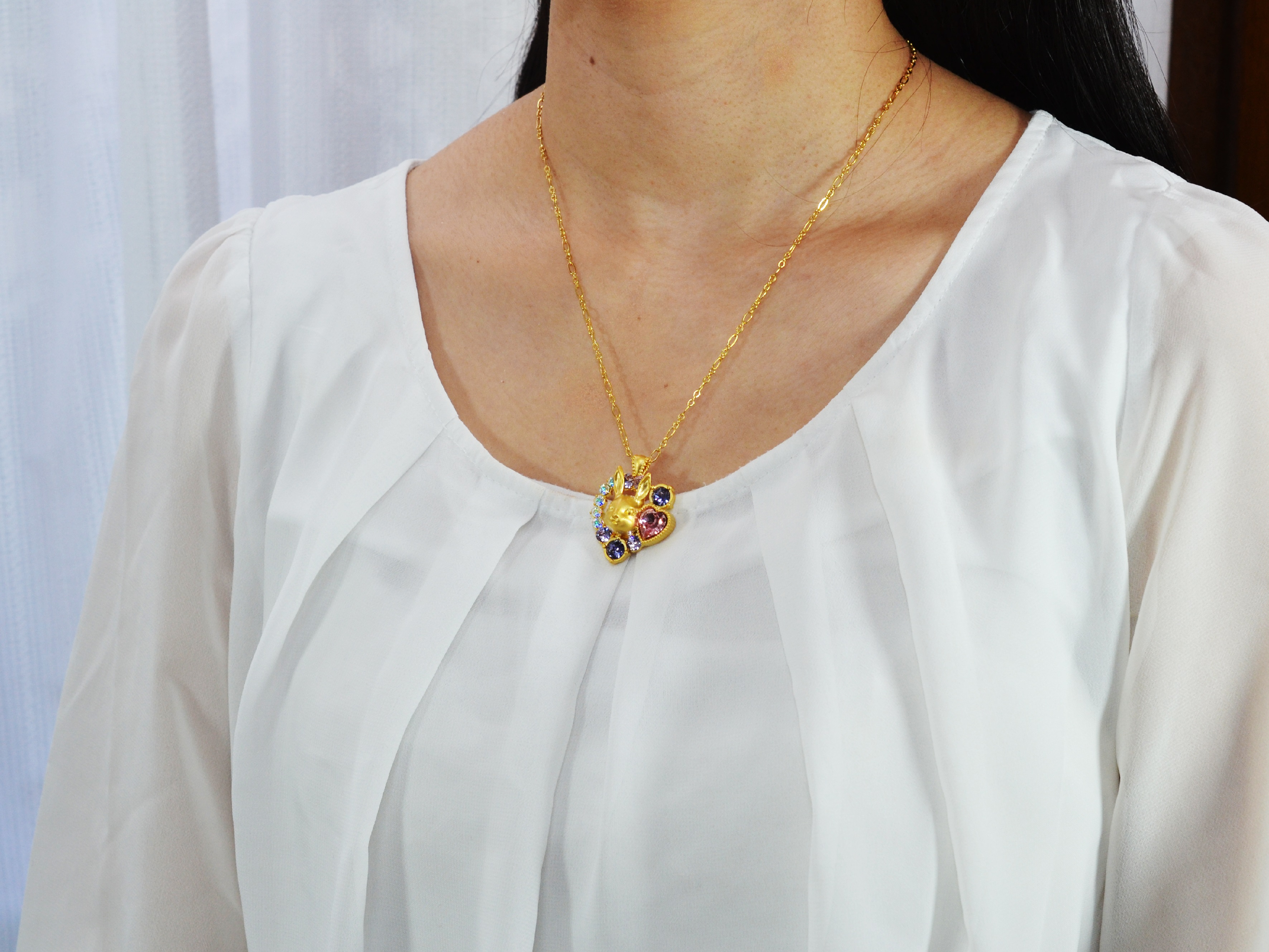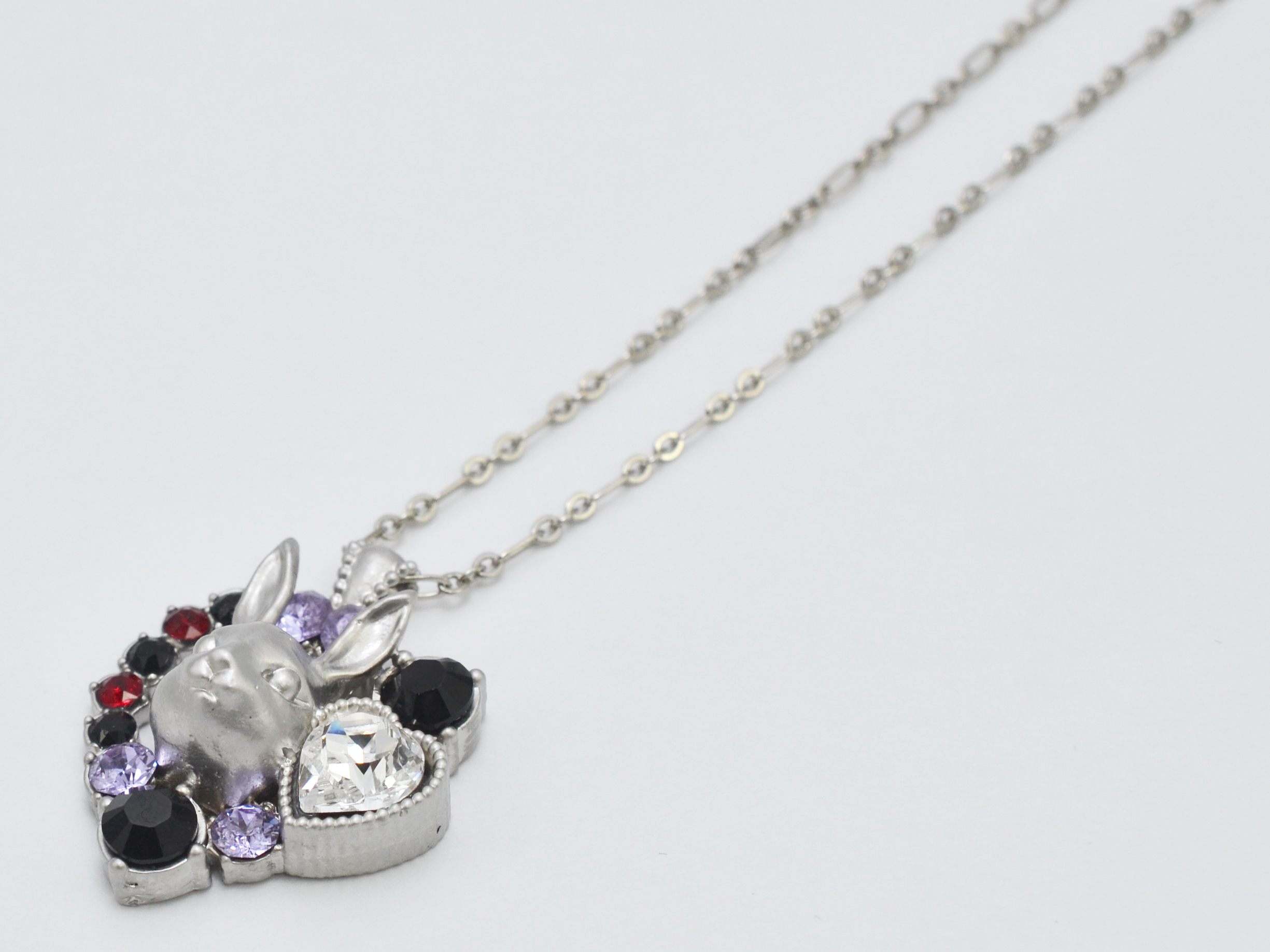 A rabbit's face surrounded by a plethora of soft colorful crystals and a heart shaped stone, in a gentle matte metallic color for an extravagant piece.
