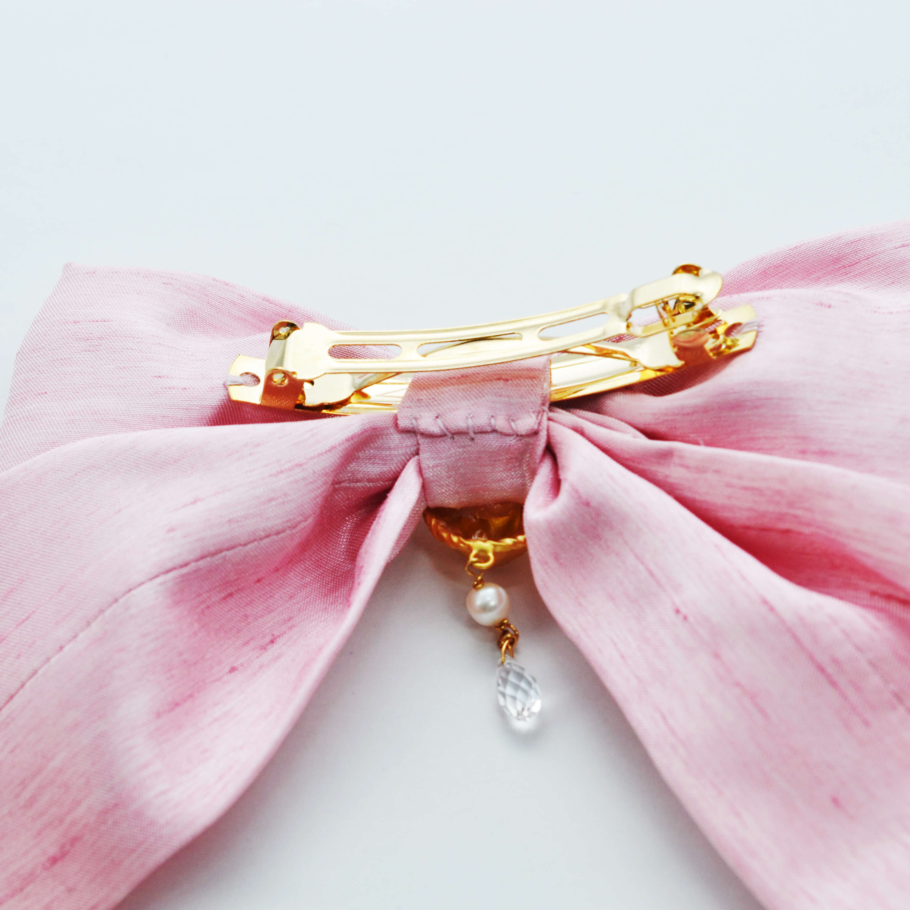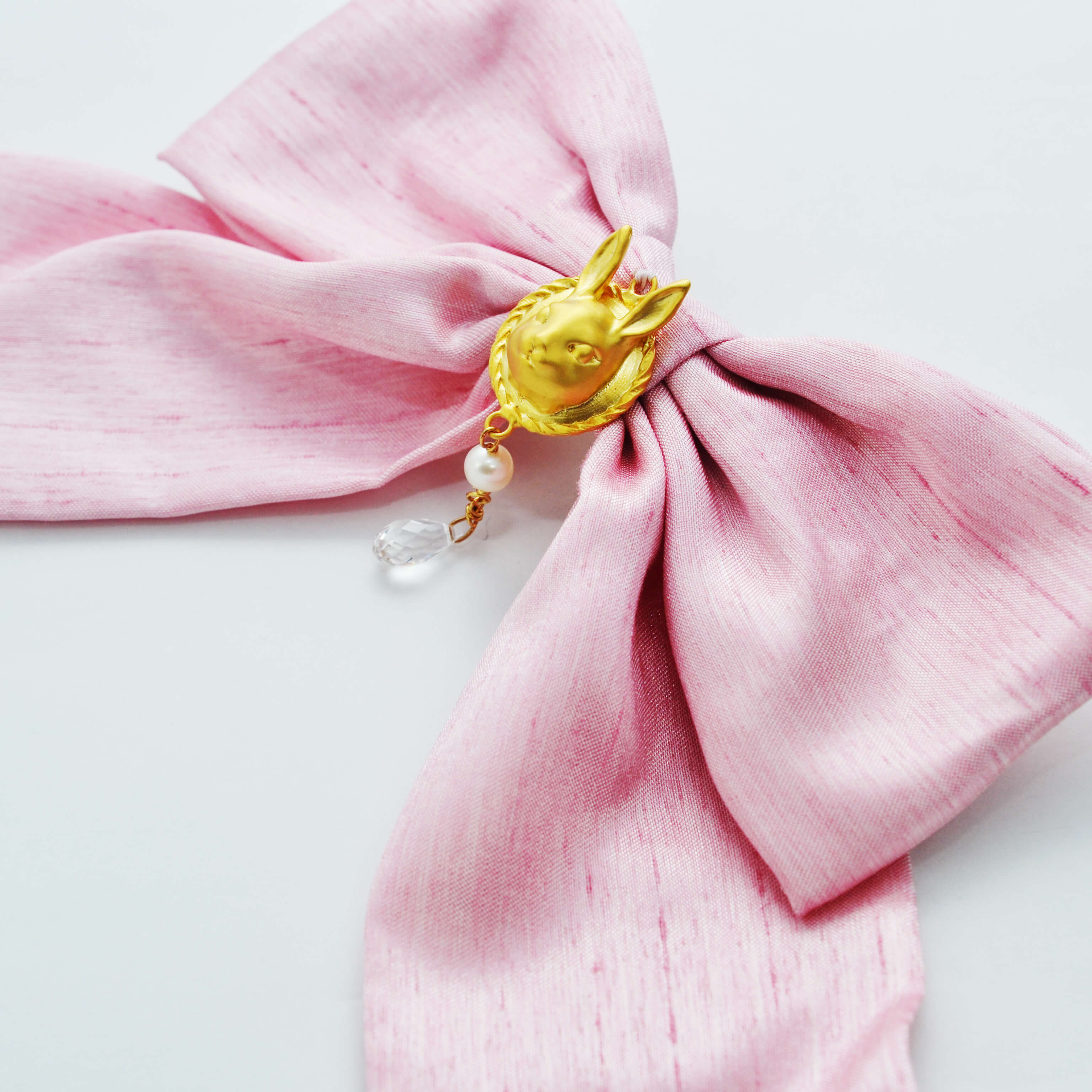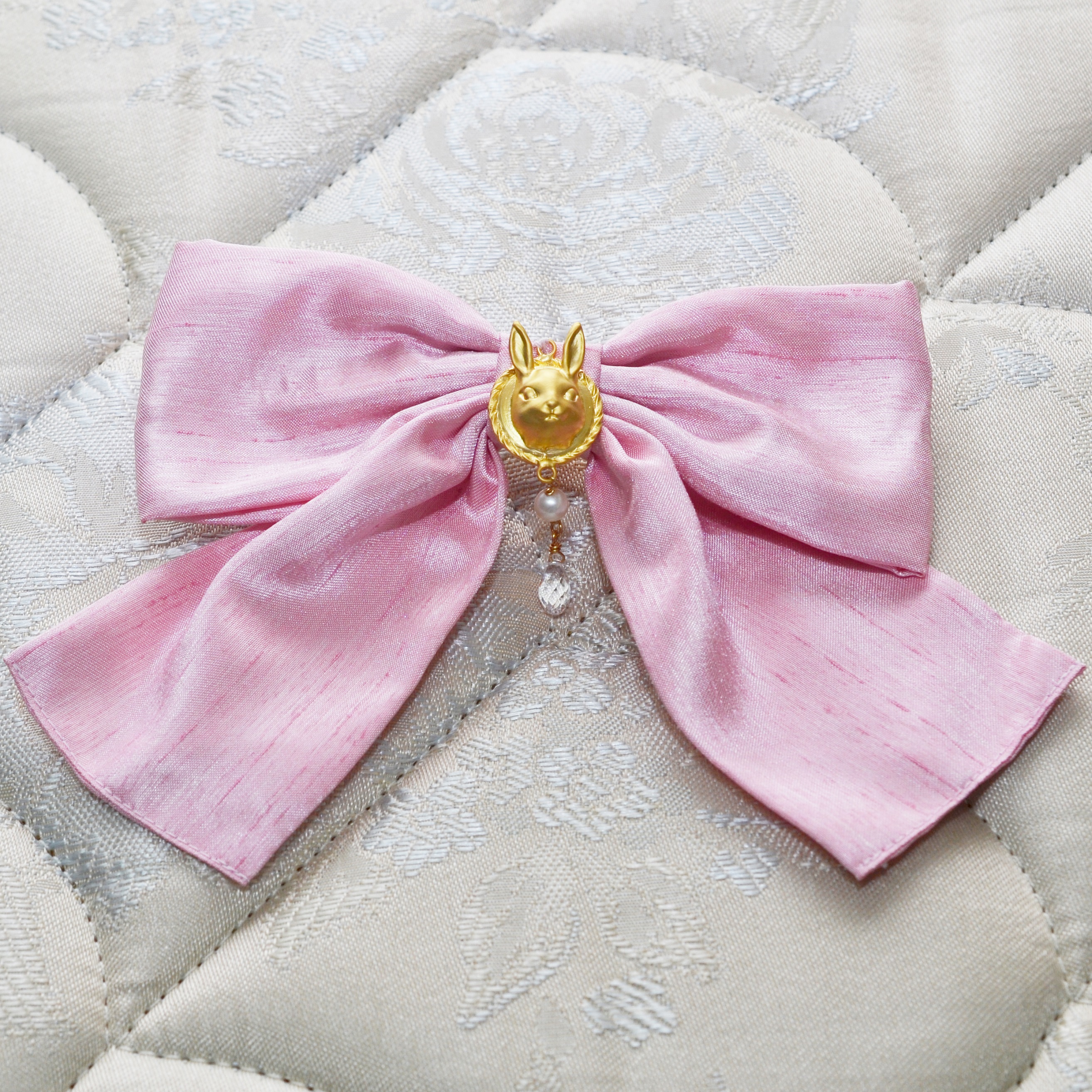 A rabbit charm on a cute bow, mounted on a barrette.