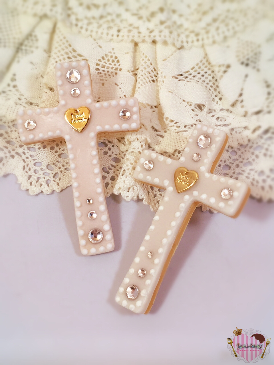 Plenty of sugar icing atop a cross-shaped cookie base made out of resin clay, decorated with gems and coated with varnish.