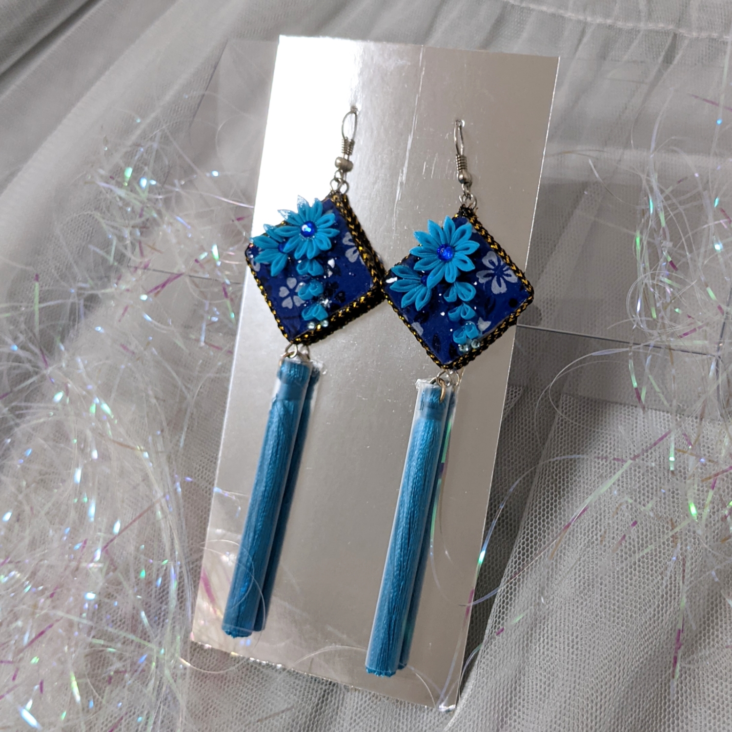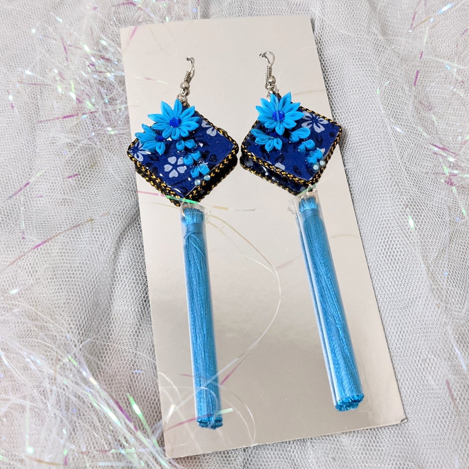 These beautiful blue floral tassel earrings are handmade by traditional Japanese artisan Orishian.
