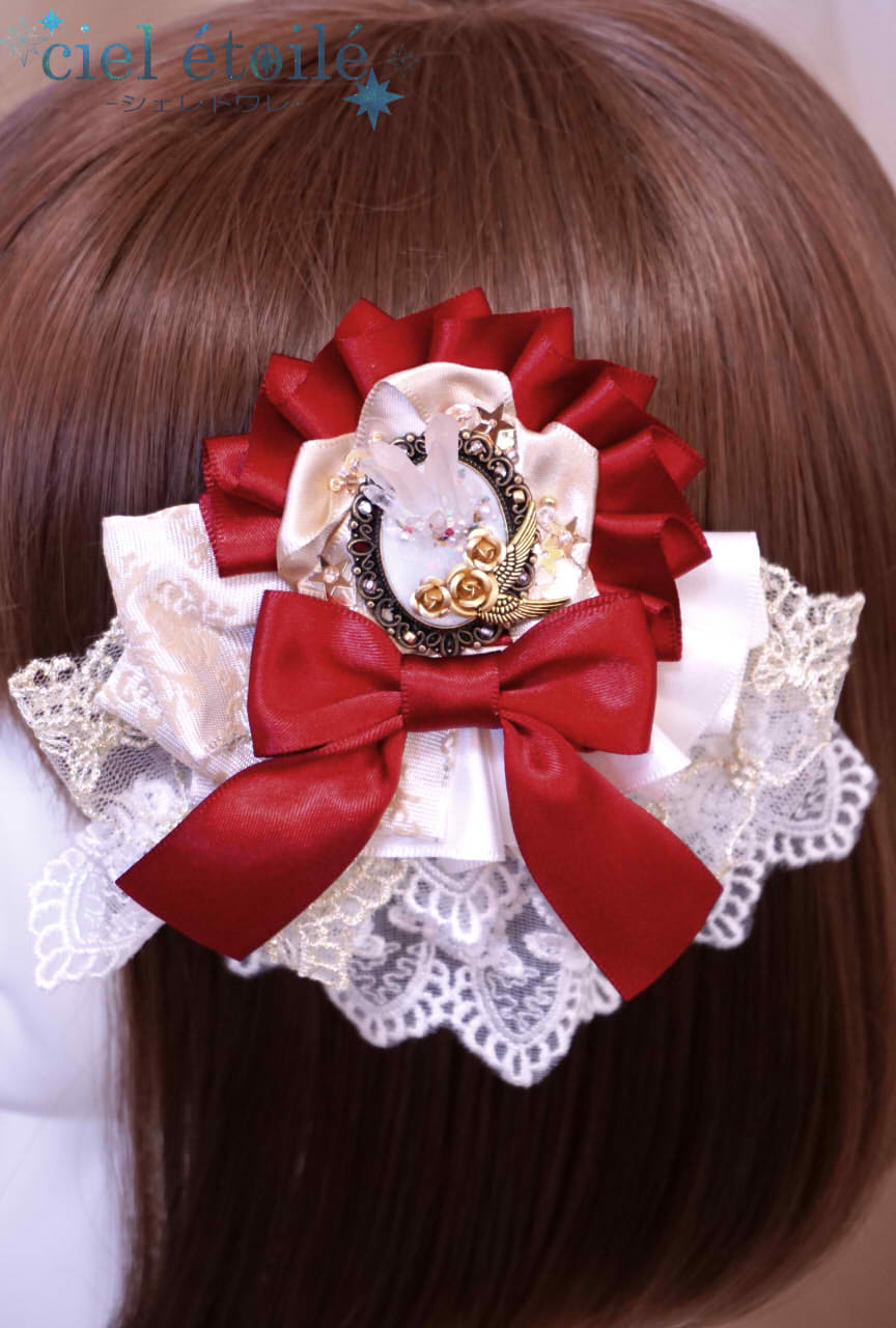 Red ribbon and ivory lace surround real crystals, wing motifs, and roses mounted to a center piece.