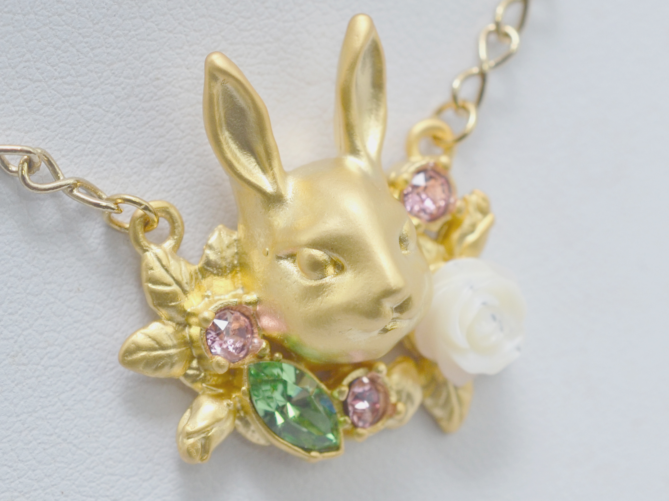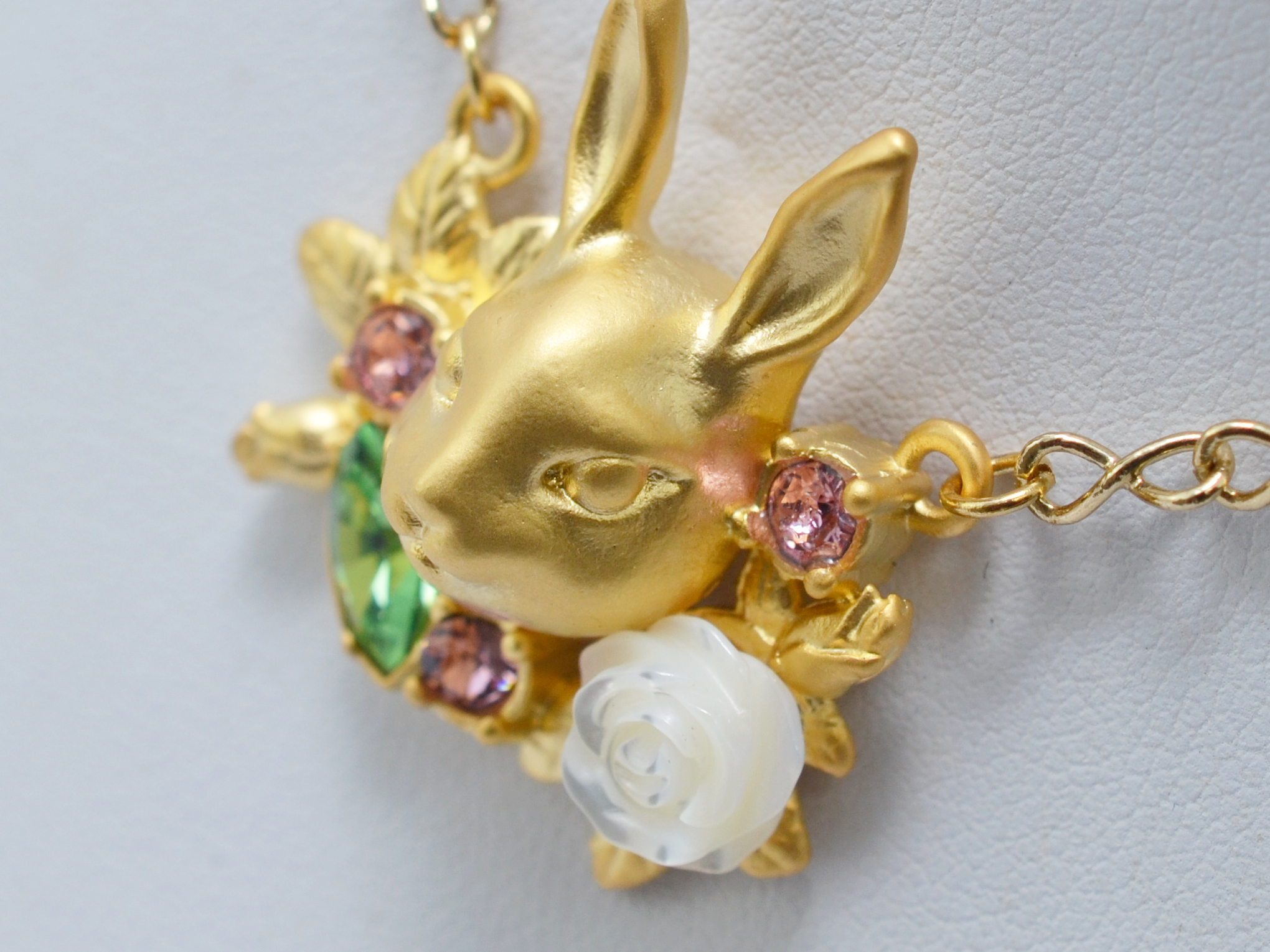 A rabbit peeking its head out from a white rose, in a soft matte gold color with a white shell rose and Swarovski crystals, this necklace is a versatile piece that can add a great touch to your outfit whether it be formal or casual.