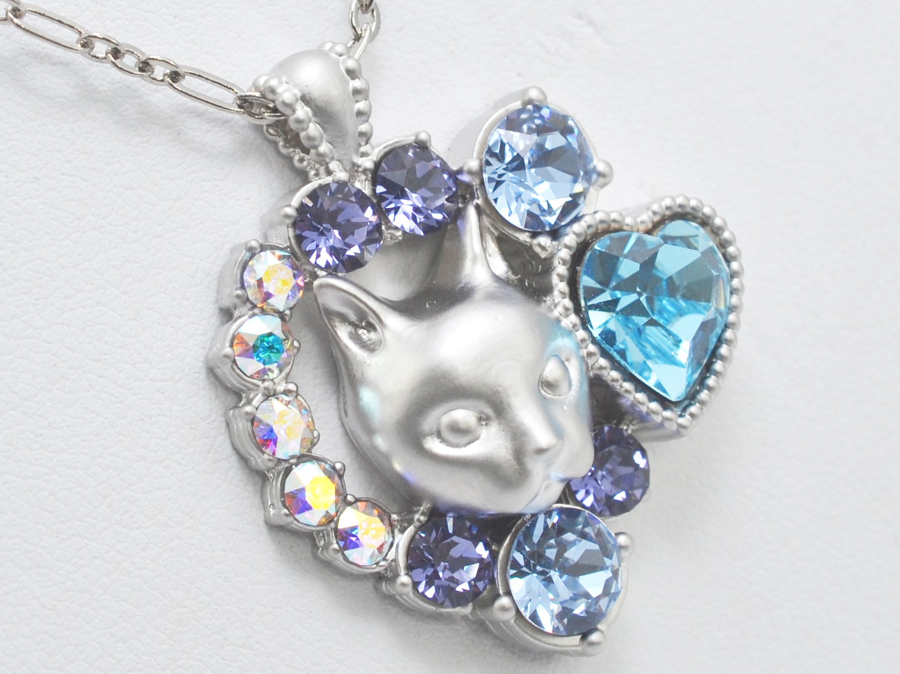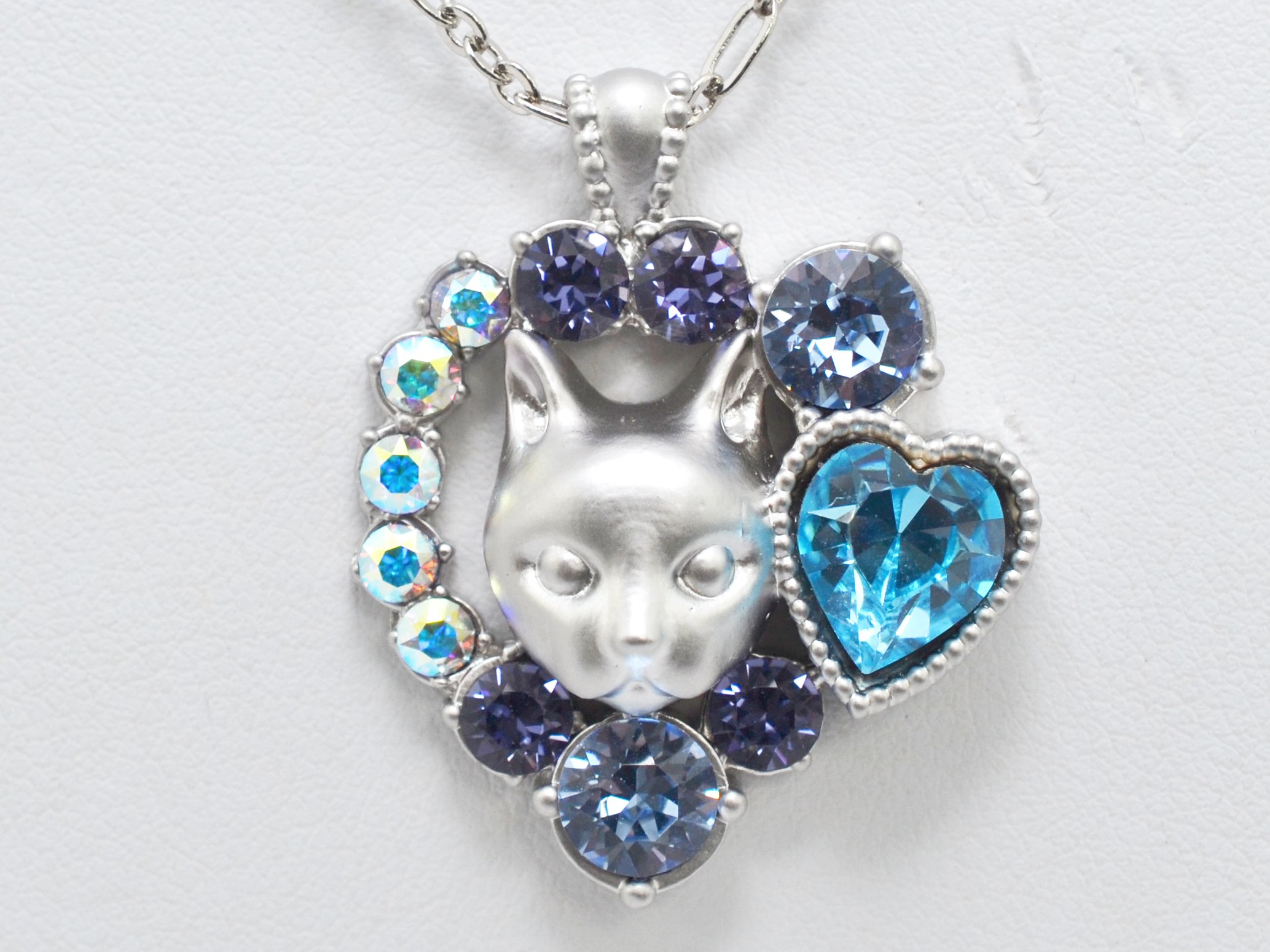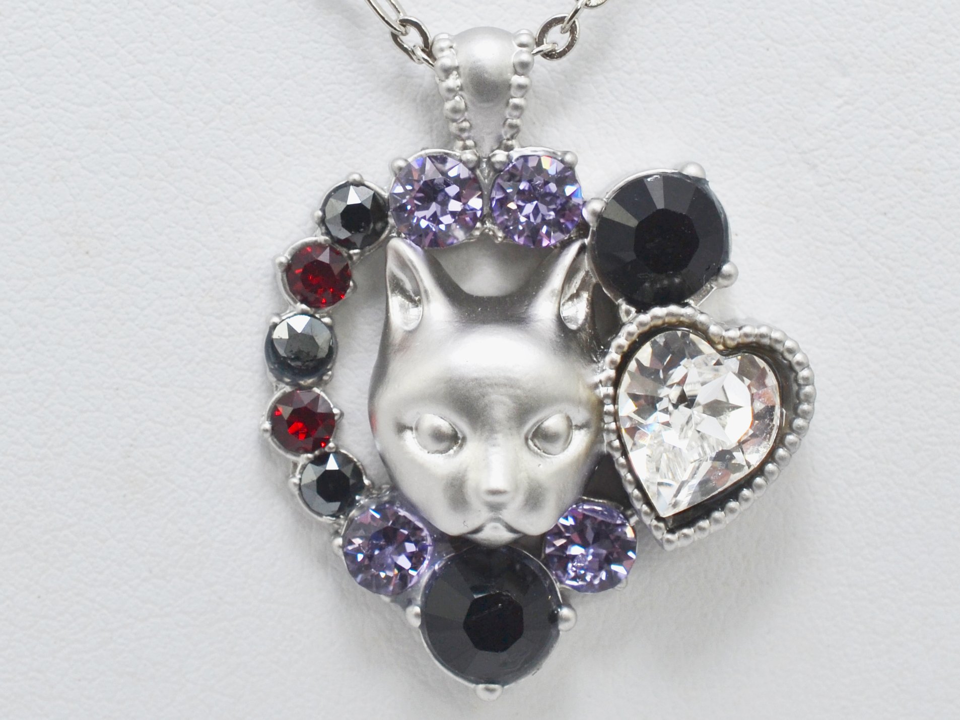 A cat's face surrounded by a plethora of soft colorful crystals and a heart shaped stone, in a gentle matte metallic for an extravagant piece.