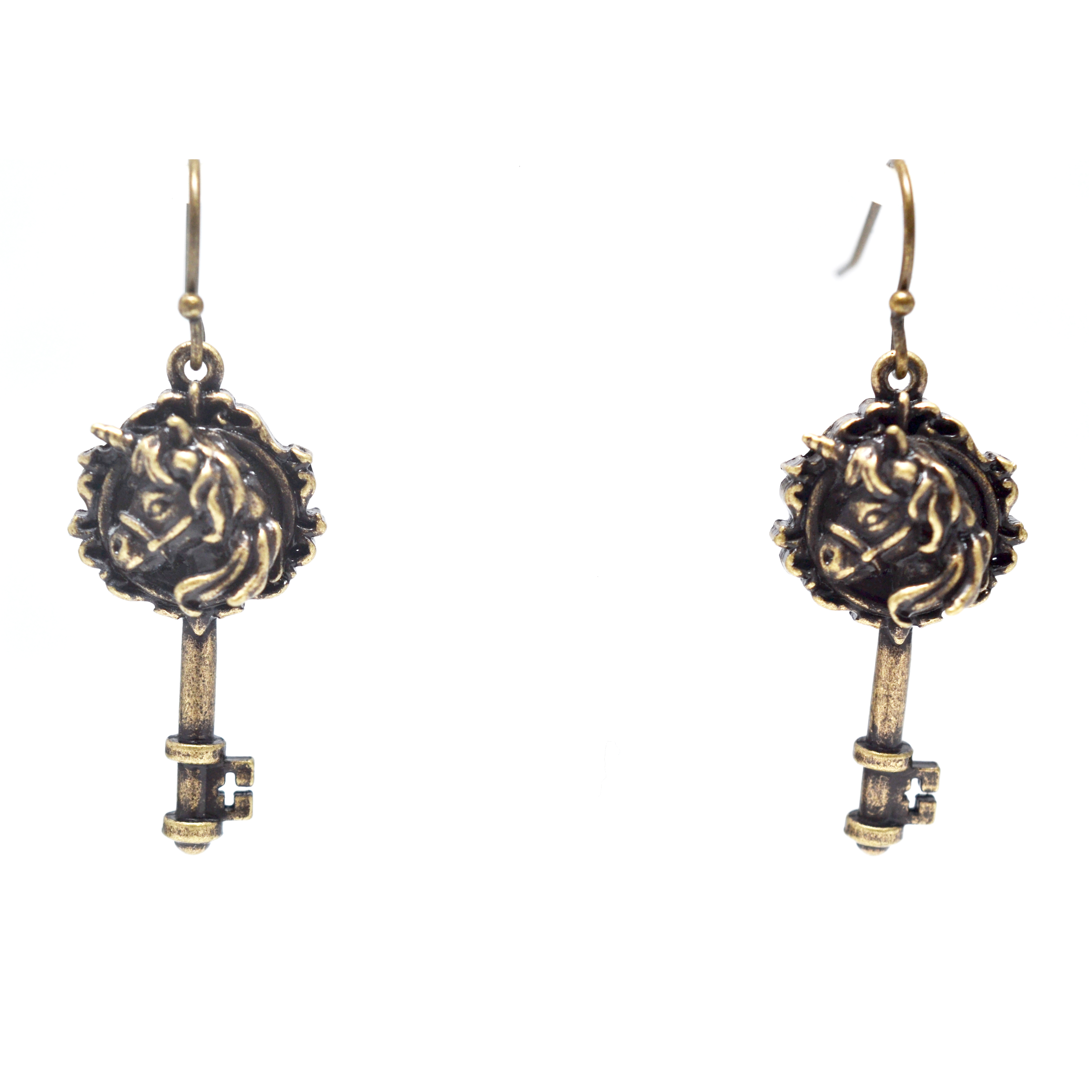 A unicorn on a key shaped pendant, in an antique style finish.