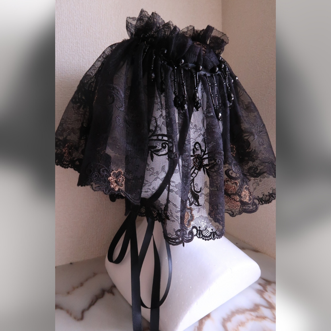 Made with long tulle lace, braided beads and pearls, for an elegant lacy veiled headdress.