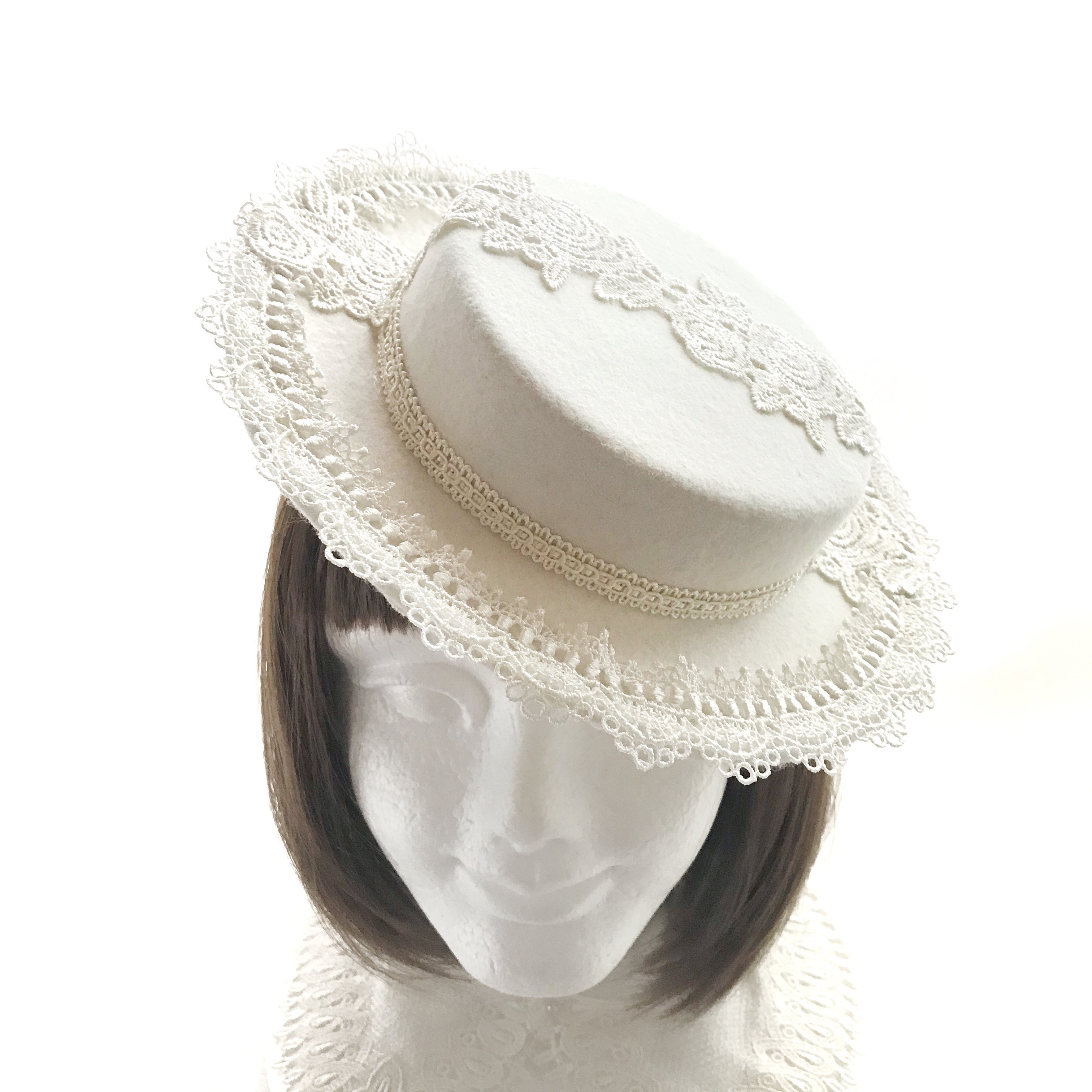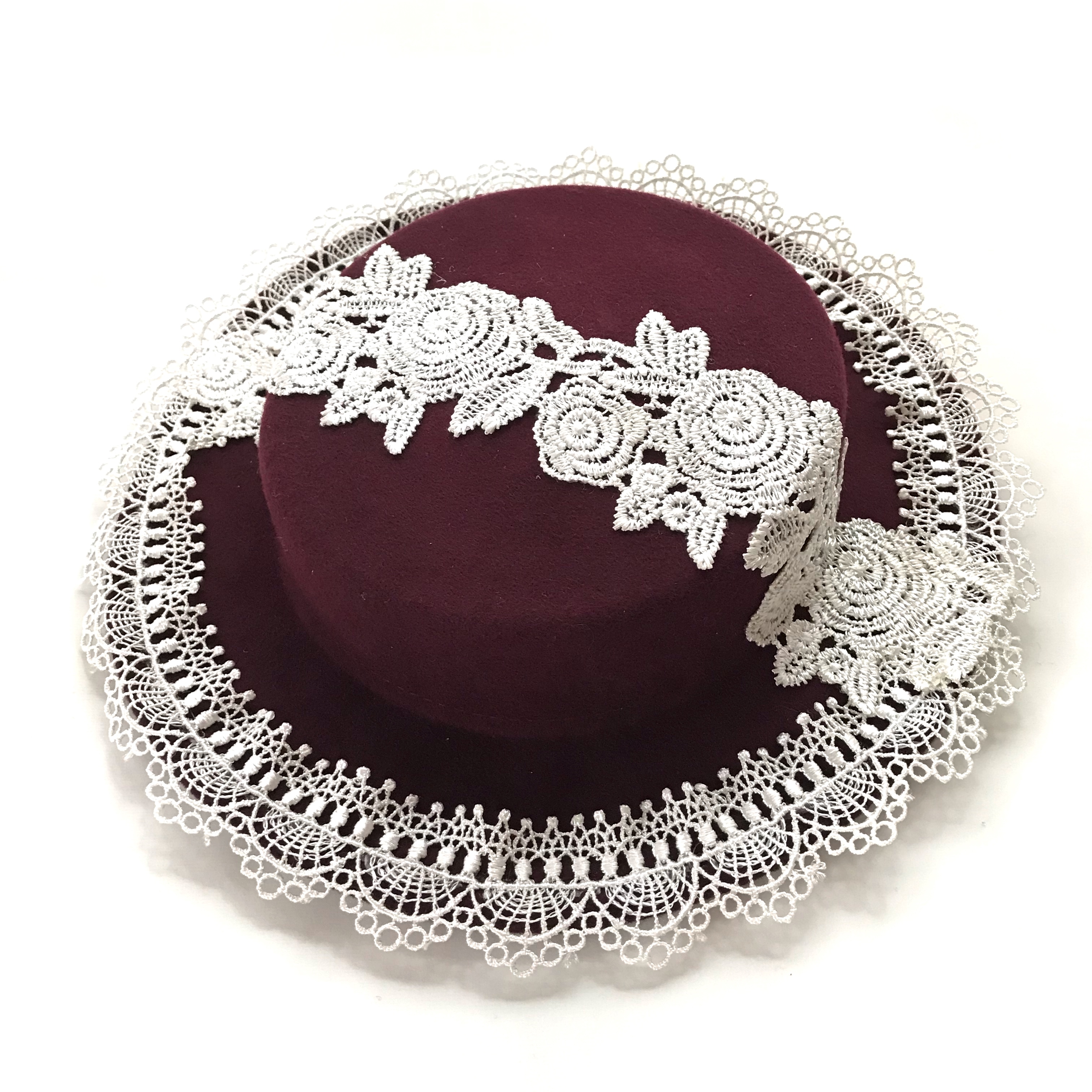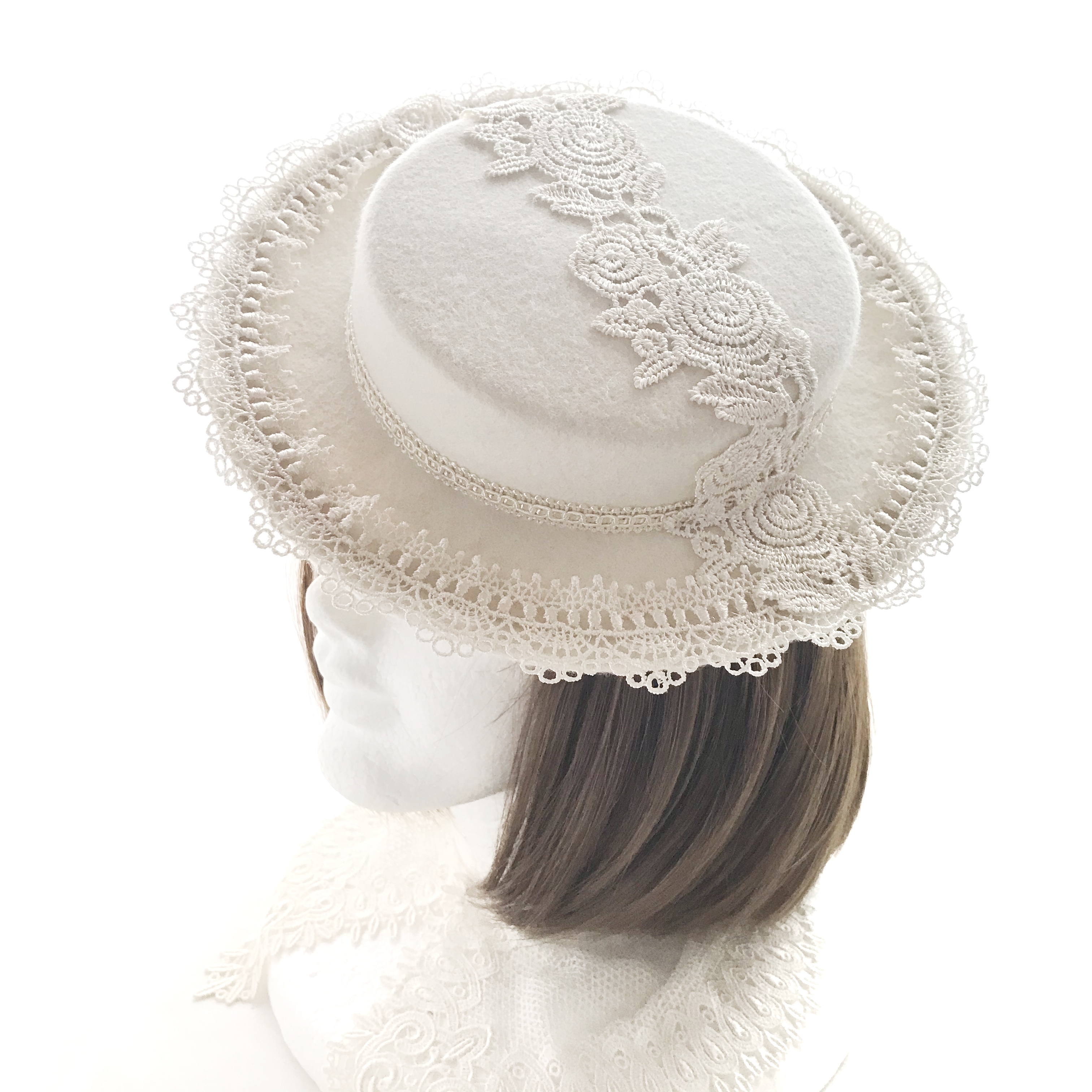 Adorned with tea-dyed lace in the inner and outer brims, and across the top for an elegant look. Pair it with a veil or corsage to take it one step further!