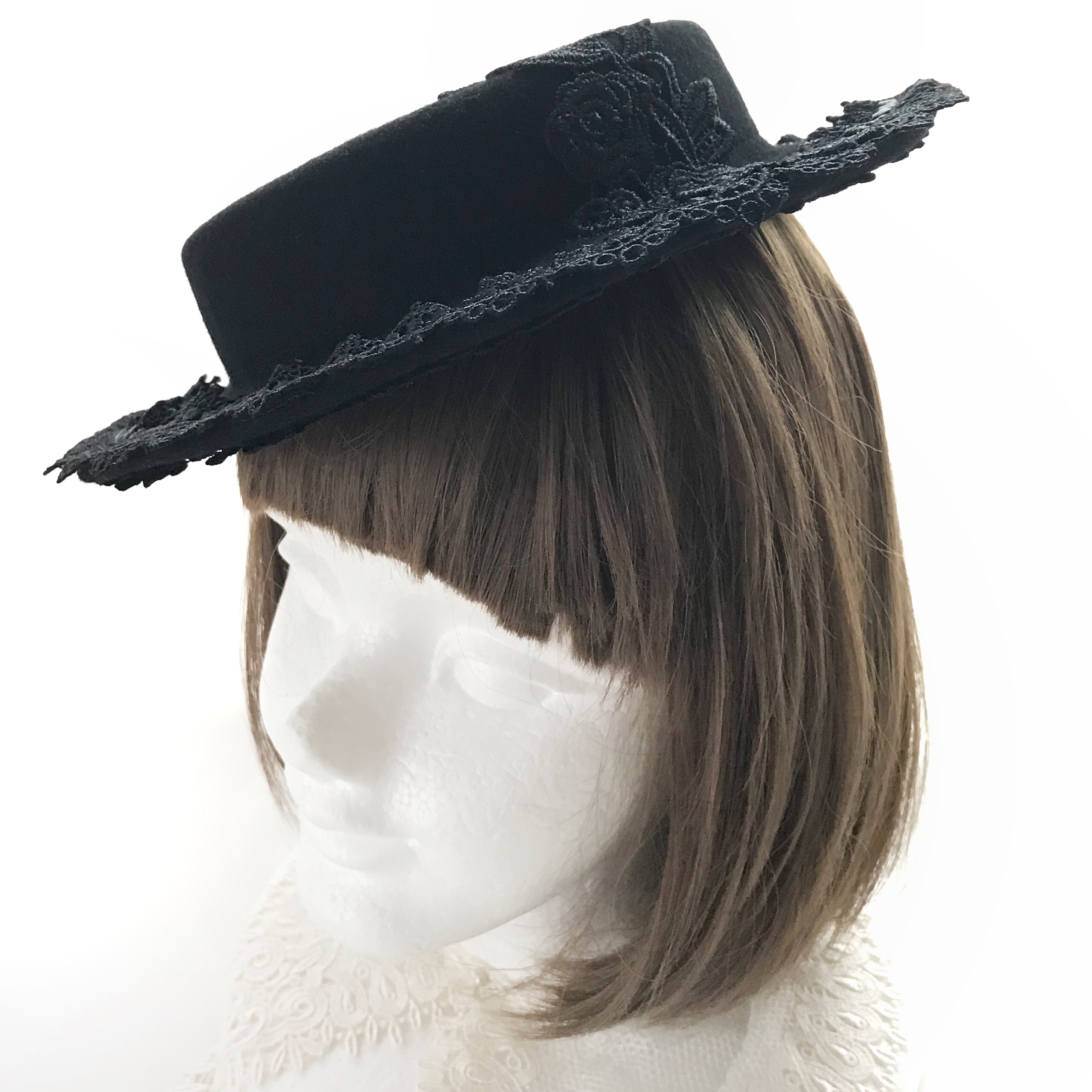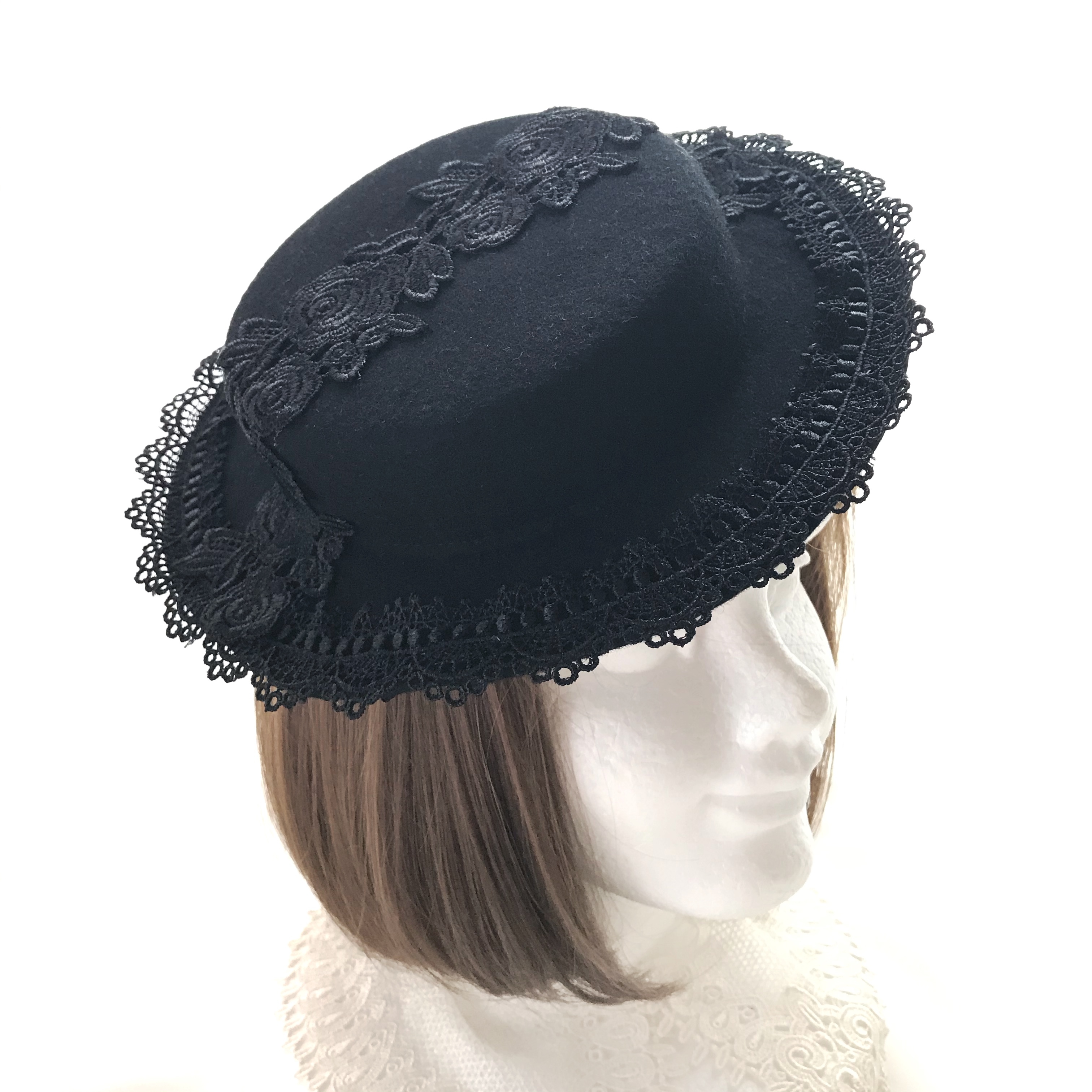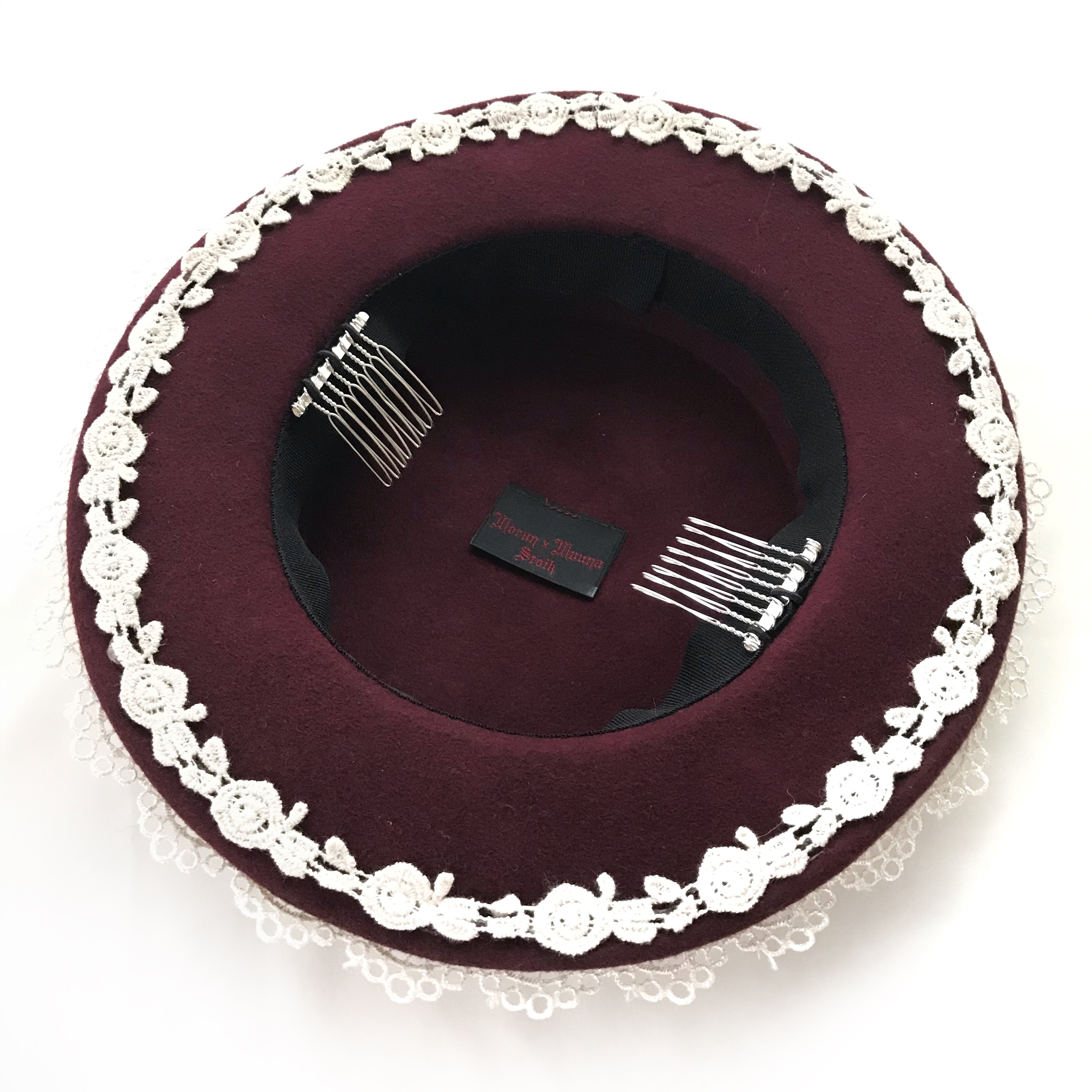 Adorned with tea-dyed lace in the inner and outer brims, and across the top for an elegant look. Pair it with a veil or corsage to take it one step further!