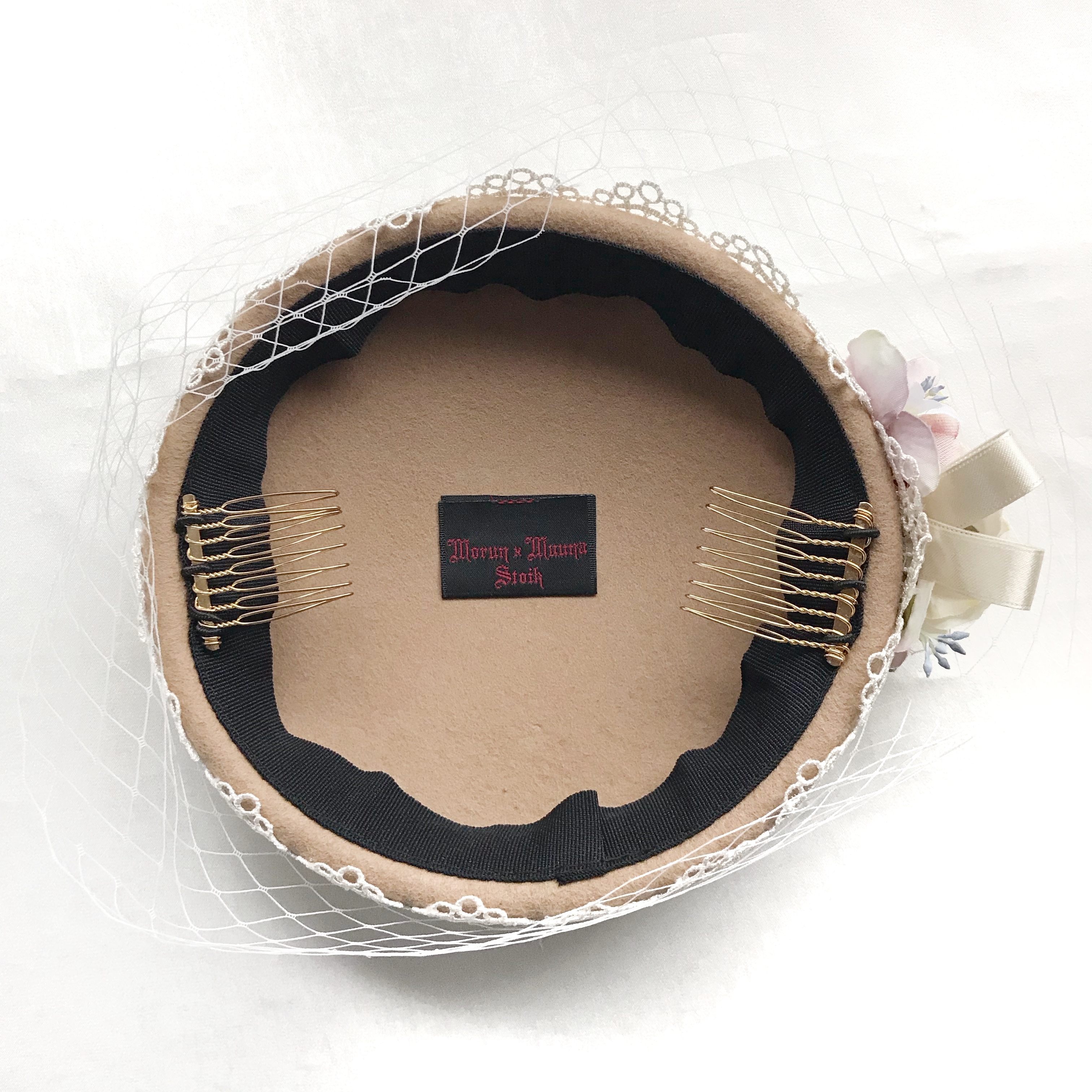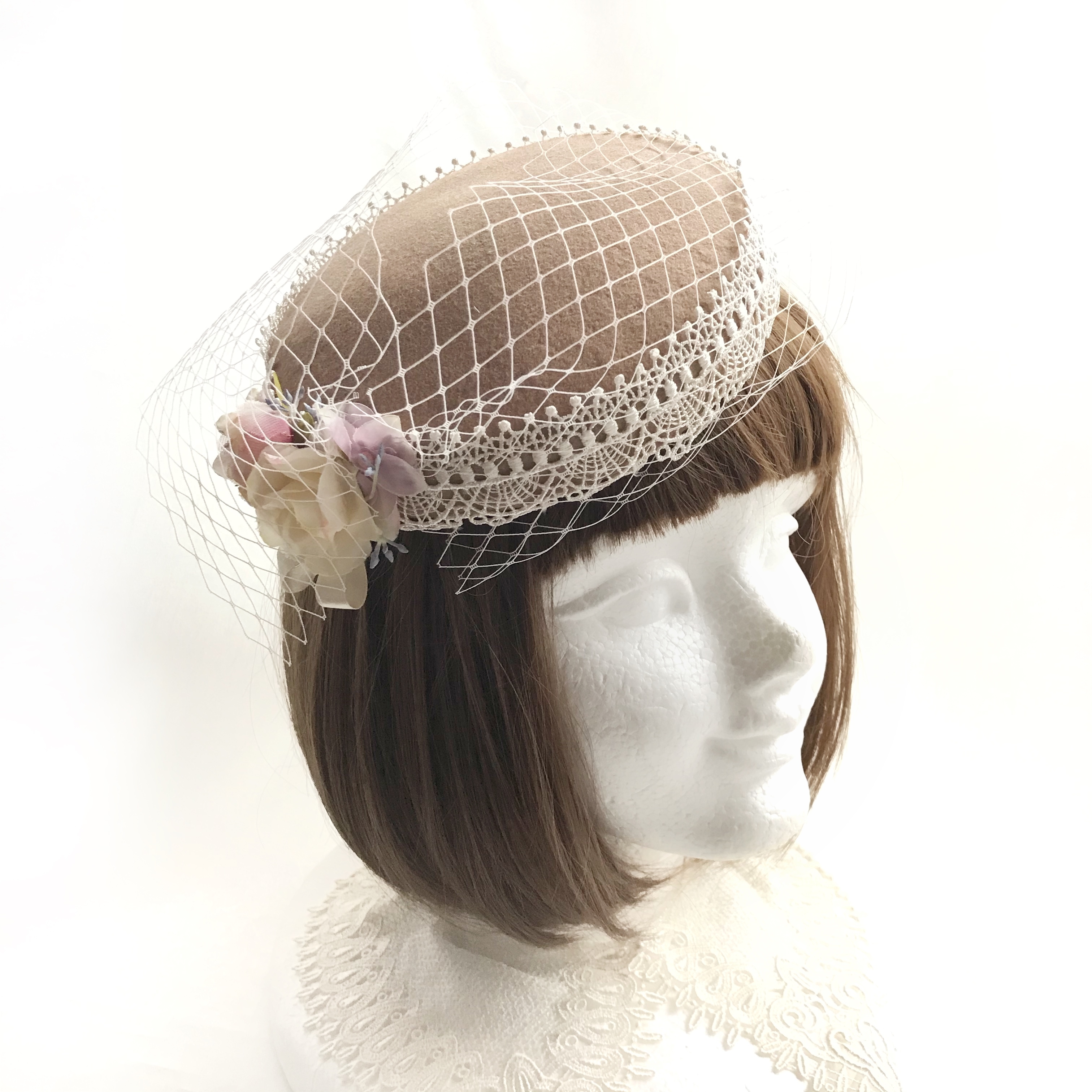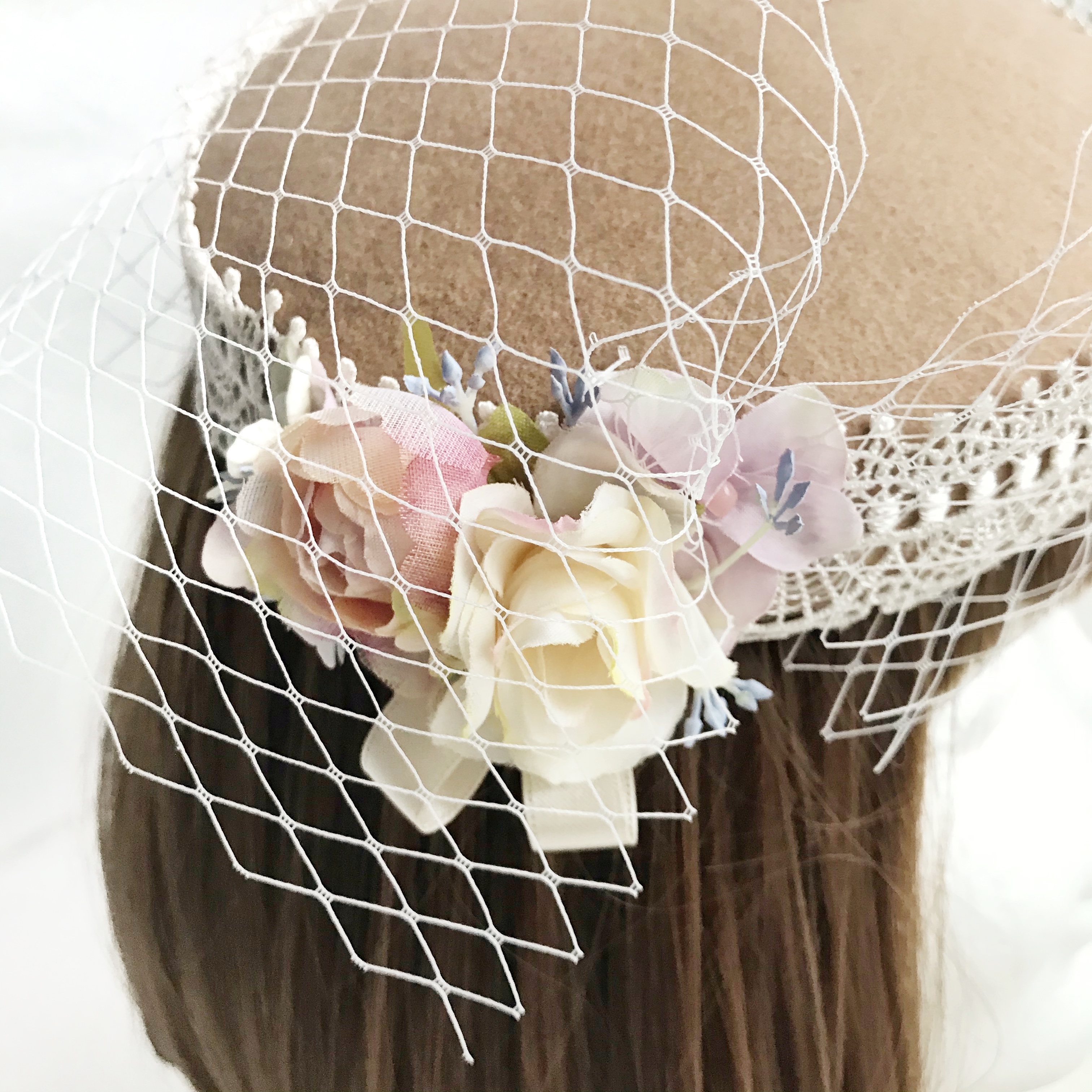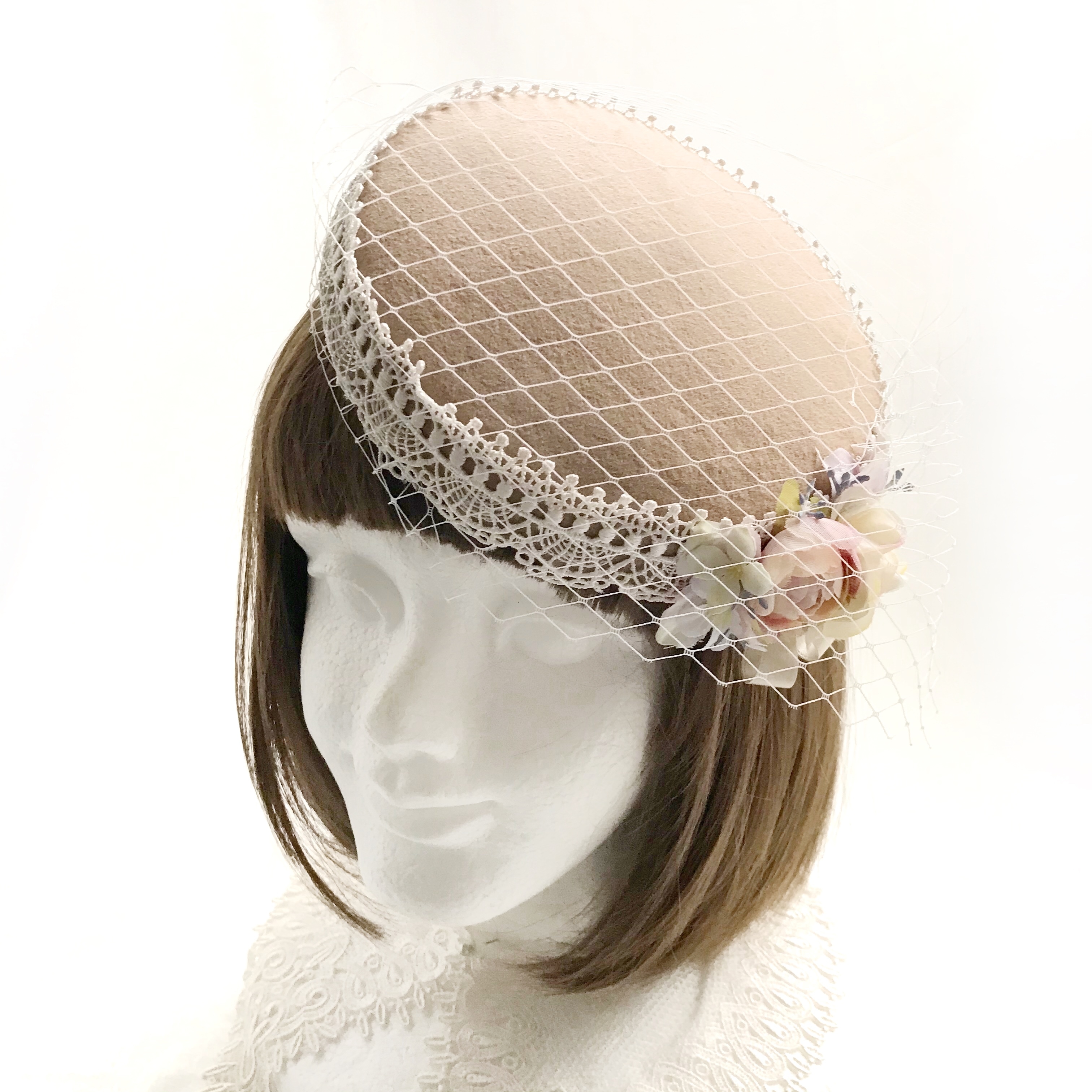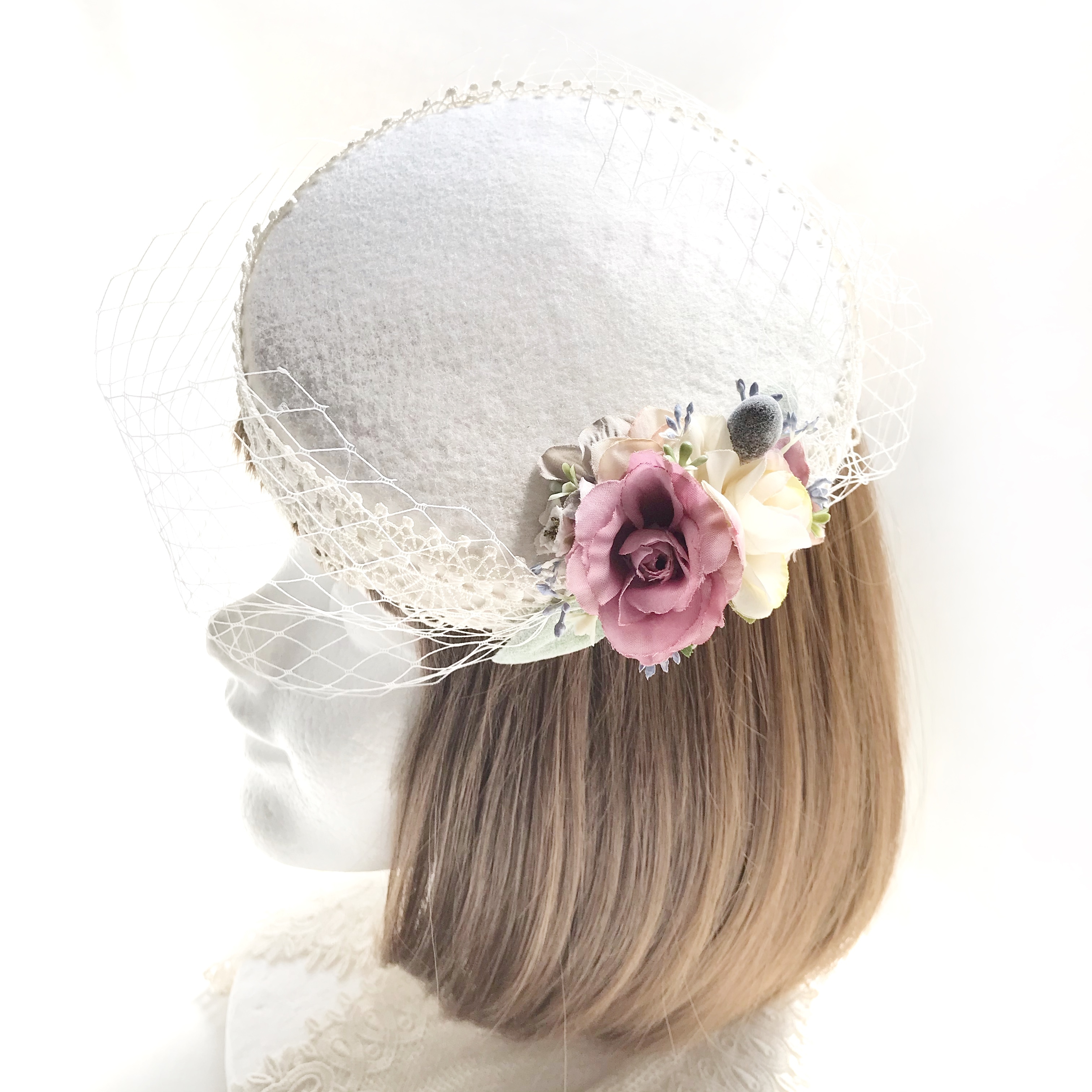 Round cocktail hat decorated with beautiful lace and dainty flowers.