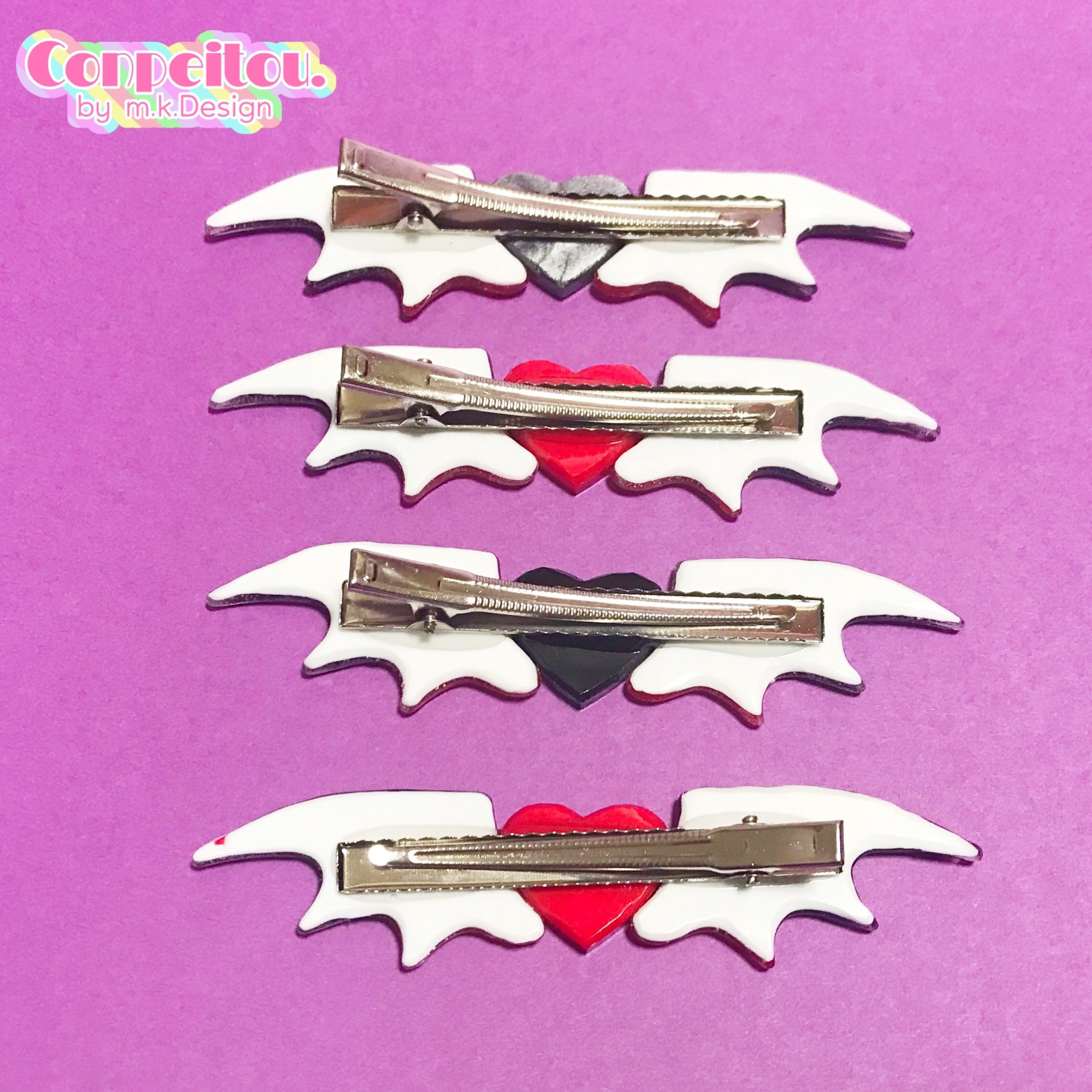 A medical heart in the middle and bat/devil wings on either side, this clip measures 10cm across from tip to tip. Mounted to an alligator clip and can be clipped anywhere!