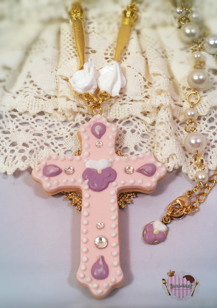 Plenty of sugar icing decoration with pansies adorning a cross-shaped cookie base. The necklace chain features cutlery parts and pearls.
