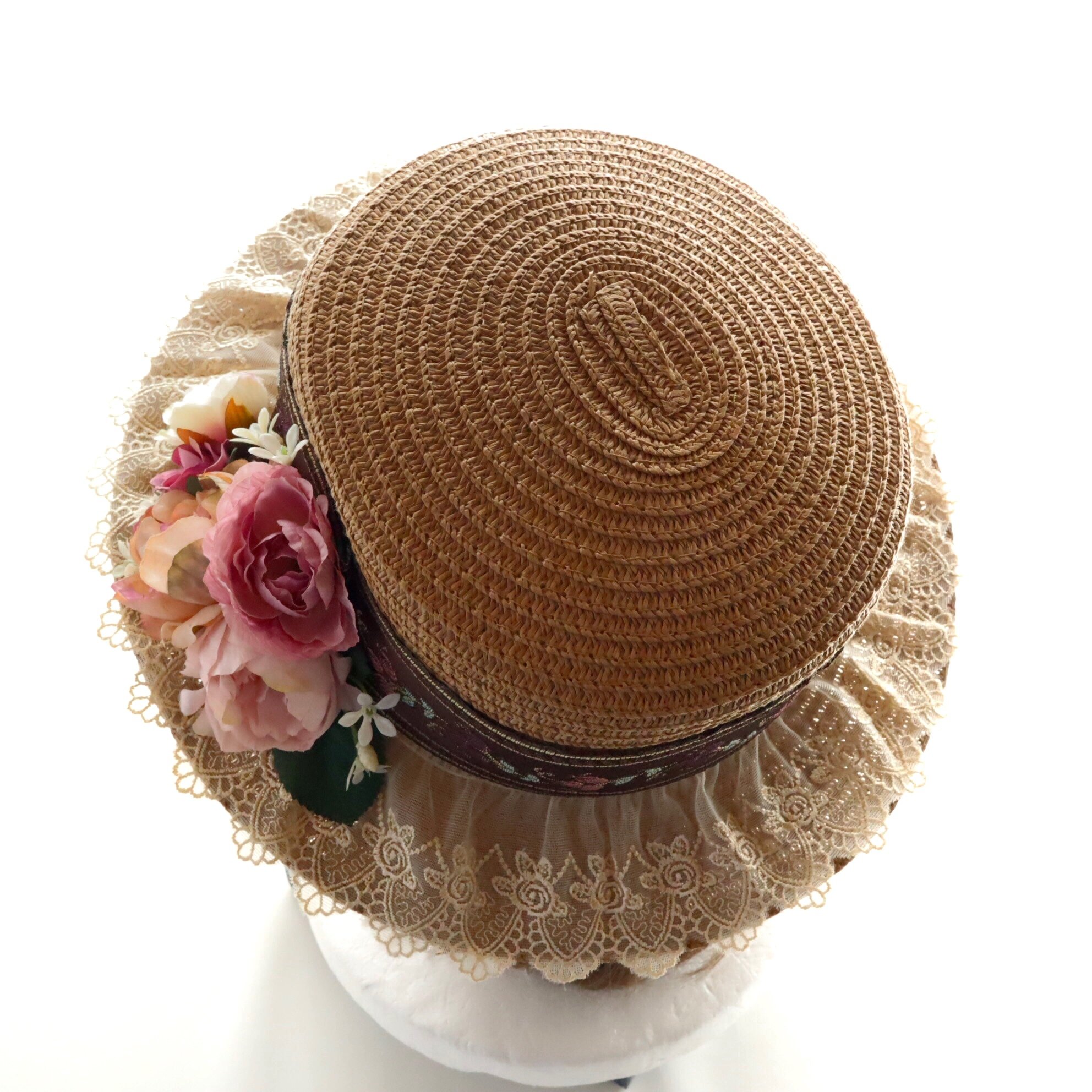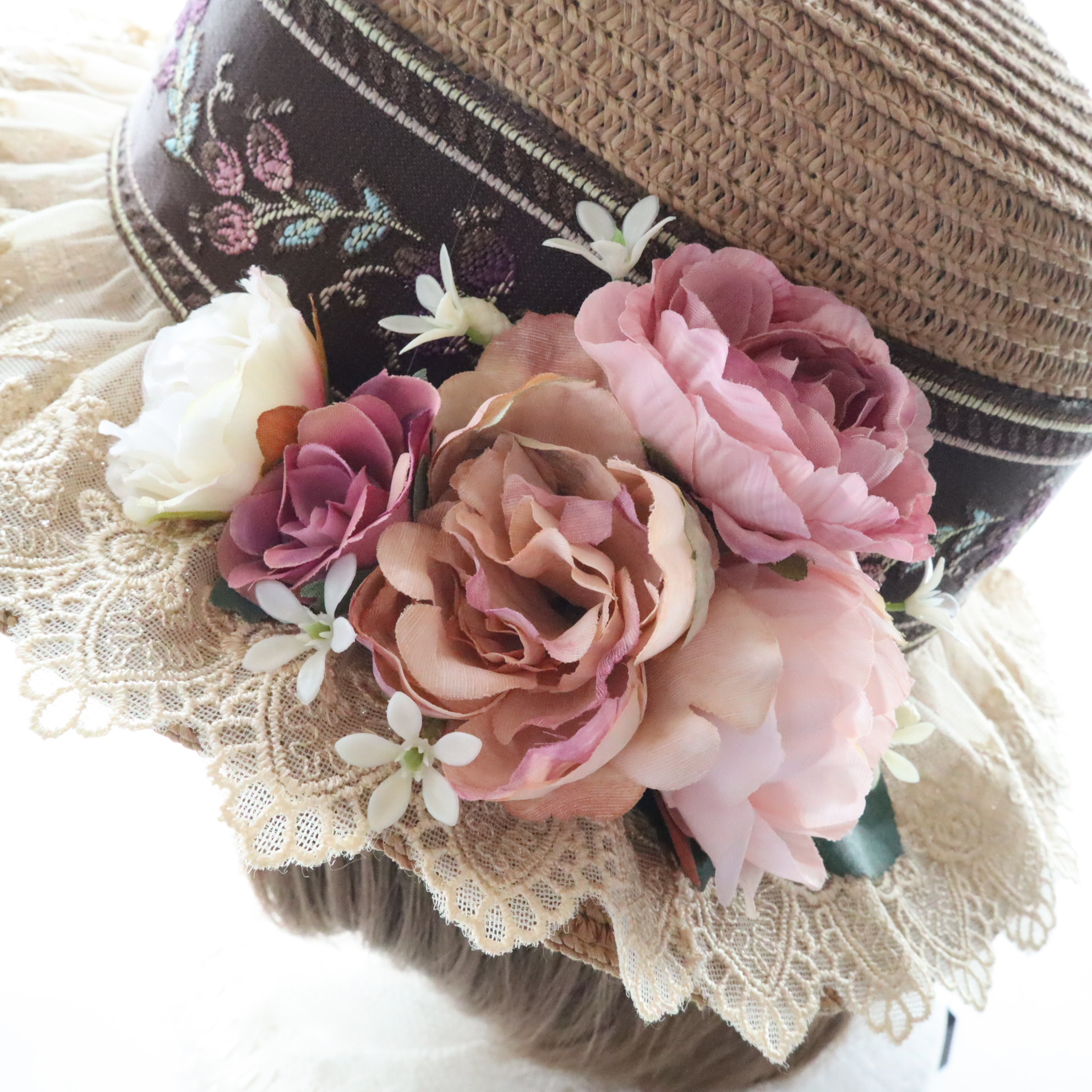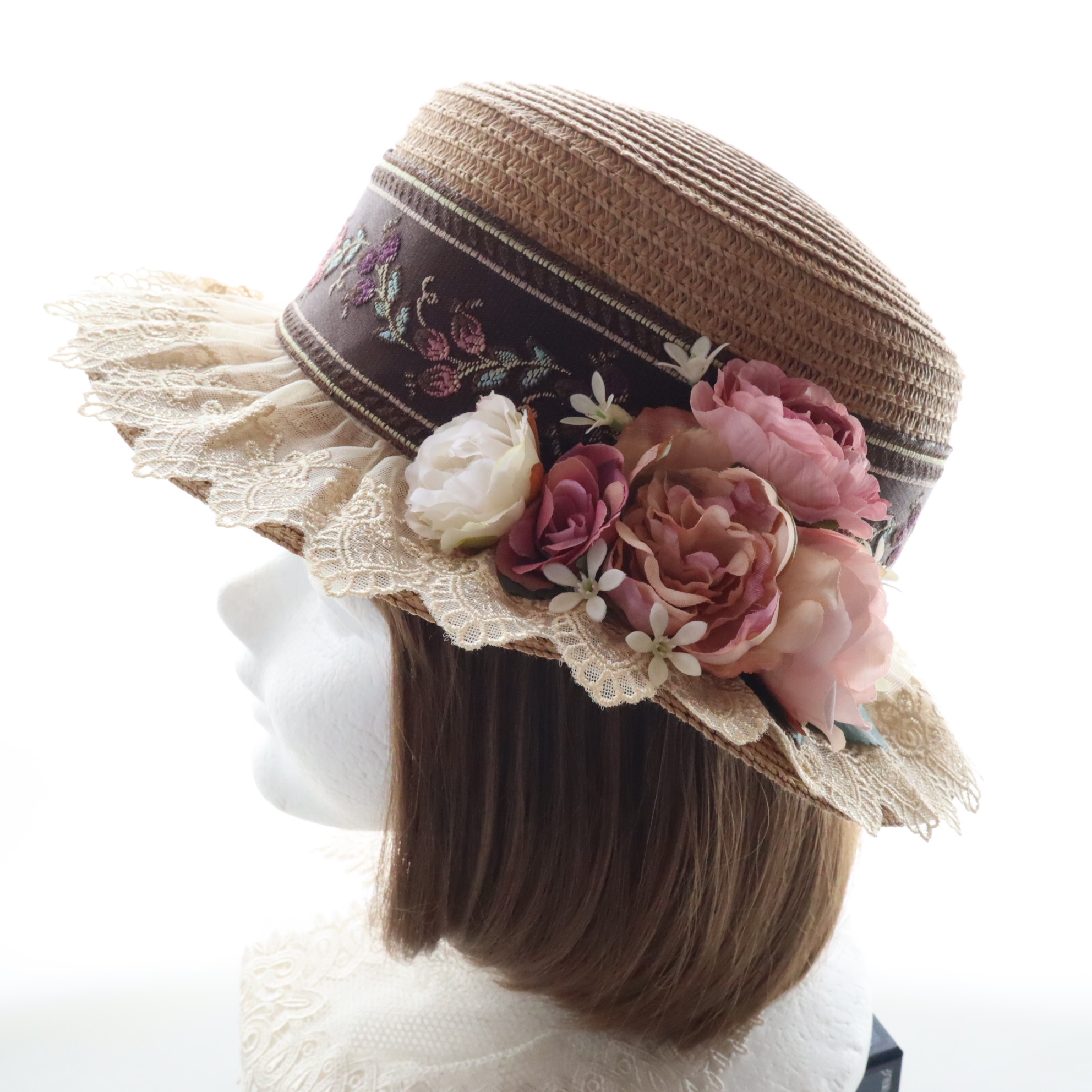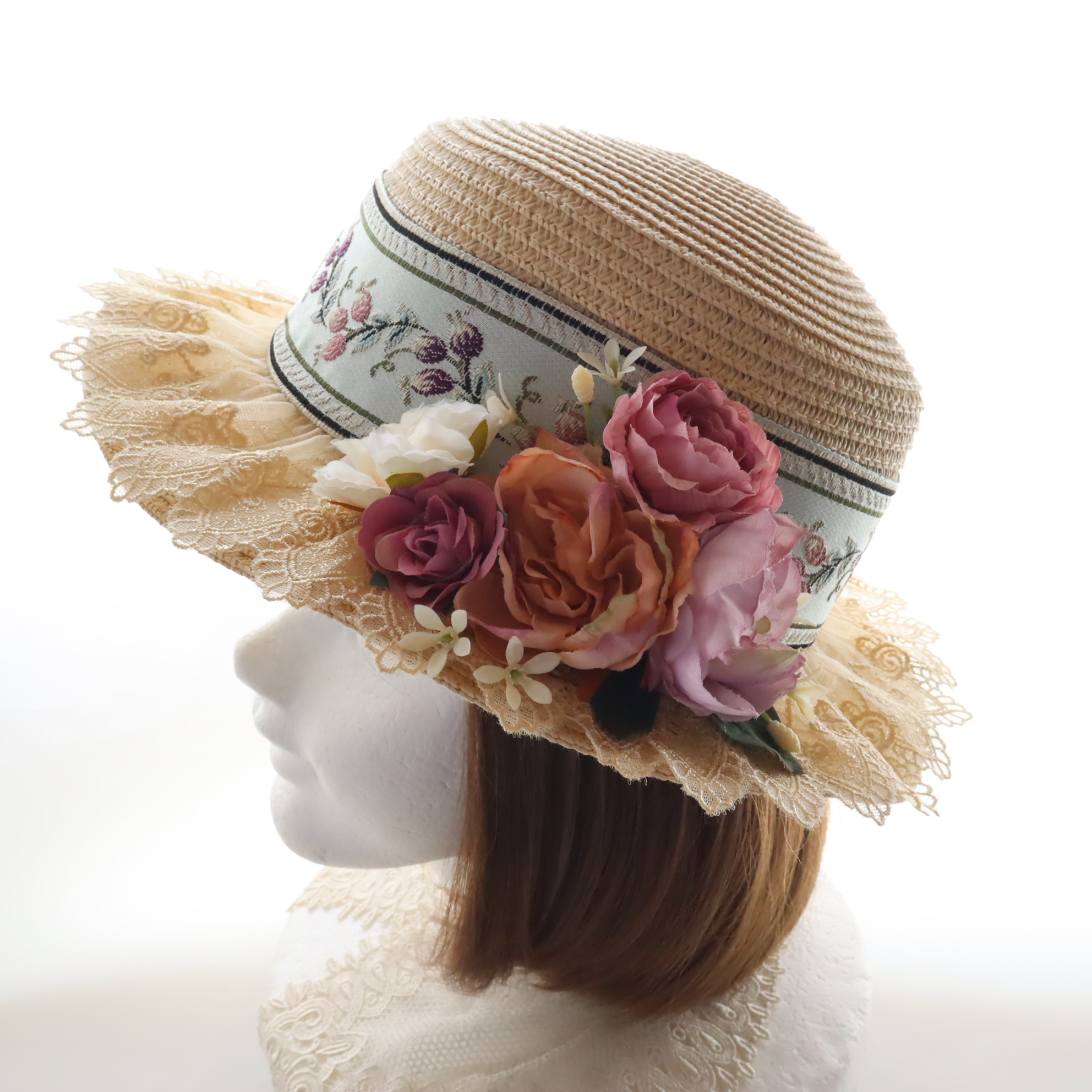 The lace on the brim features beautiful, elegant rose embroidery, and the ribbon around the hat is embroidered with flower buds and has a slight sheen to it.
