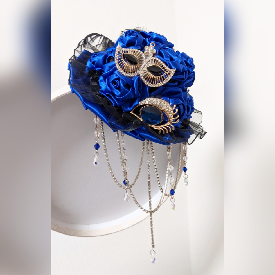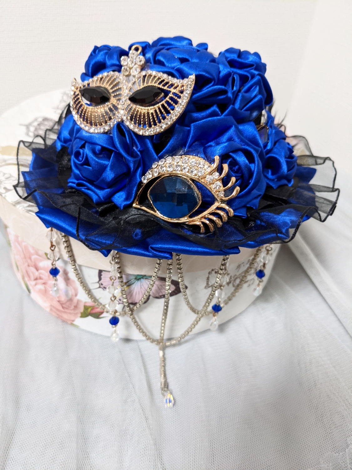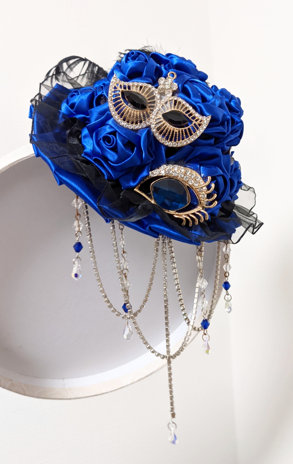 This original royal blue and black mini hat is handmade by traditional Japanese kanzashi artisan Orishian, part of their Girly Collection.