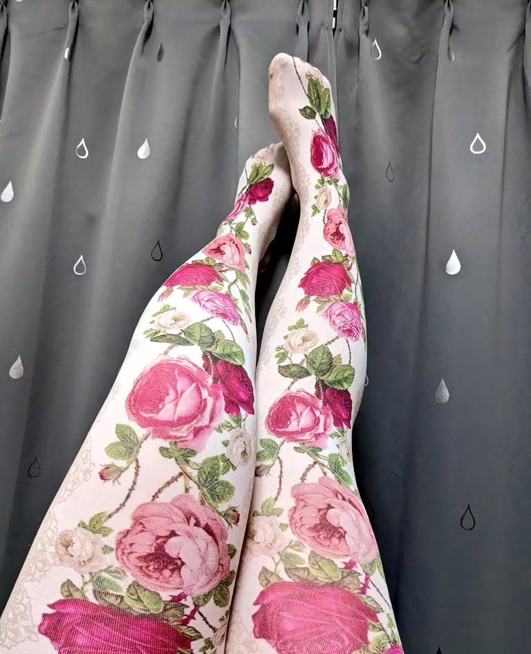 With gorgeous roses and carefully drawn lace details, these tights were originally designed and sold by the Japanese indie brand, Morun x Muuna Stoik (moe-run moo-nah stoic), as printed over-the-knee socks.